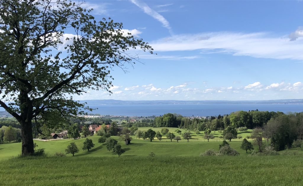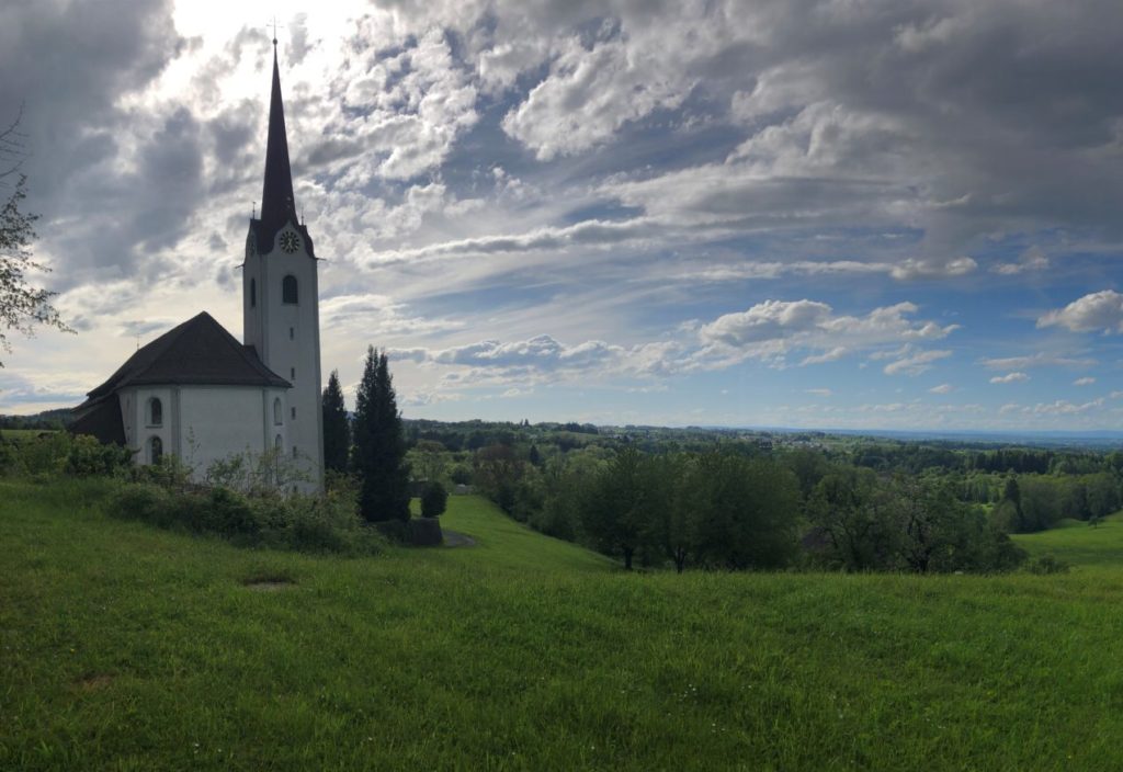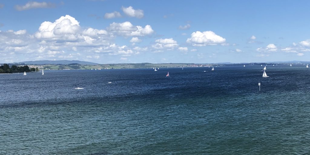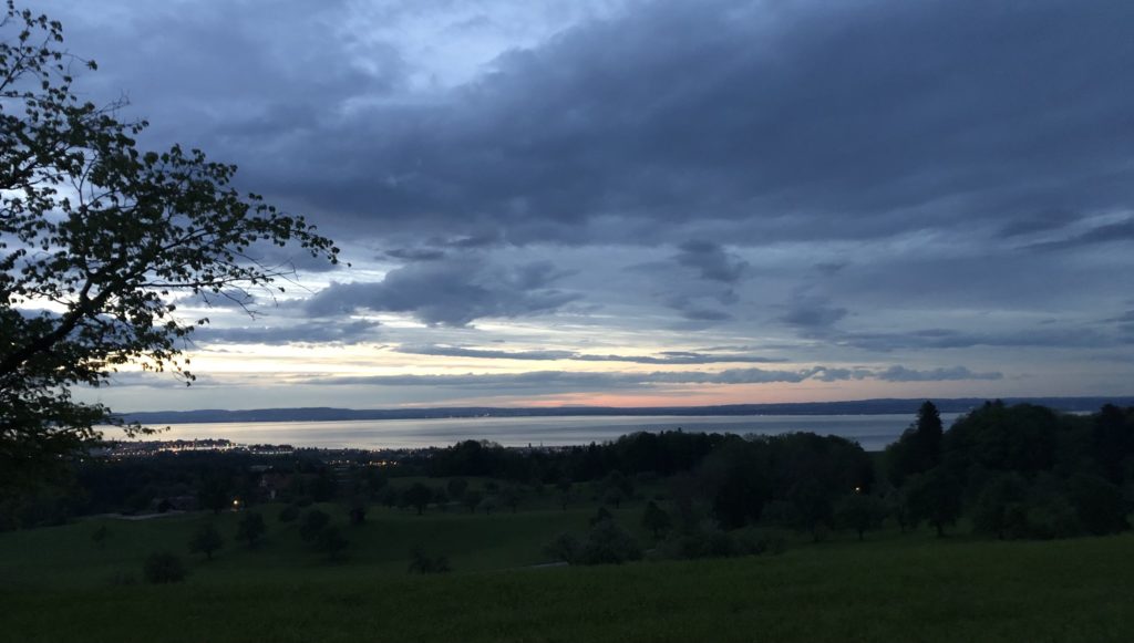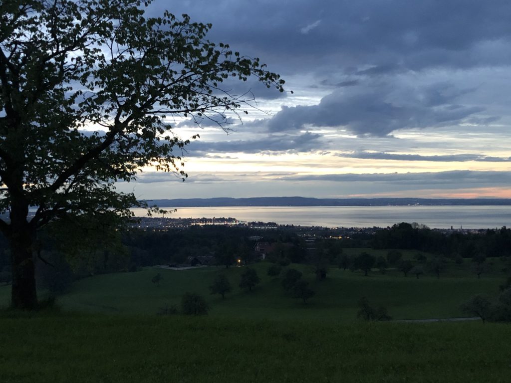 So gestärkt fahren wir weiter am Bodensee entlang bis Arbon und weiter zu unserem Übernachtungsplatz in Untereggen (Spielbüelstraße 10). Diesen Stellplatz sowie auch den schönen Parkplatz am Bodensee (auf dem man auch hätte übernachten können) haben wir wie (fast) immer in der App „Park4Night“ gefunden. Das Navi führt uns den Berg hinauf in eine abgelegene Ortschaft. Neben Sport- und Spielplatz sowie Kirche öffnet sich uns nach enger Zufahrt ein Traumpanorama mit Blick auf den See. Selten haben wir so eine schöne unverbaute Aussicht auf den Bodensee gehabt. Und schon gar nicht von einem Parkplatz aus, der noch dazu gebührenfrei ist. Den ganzen Tag hatten wir Sonnenschein mit ein paar wenigen Schleierwolken. Dazu allerdings kräftigen Wind. Dieser vertreibt nun auch die schwarzen Regenwolken über Untereggen und wir erleben einen traumhaften Abend.
