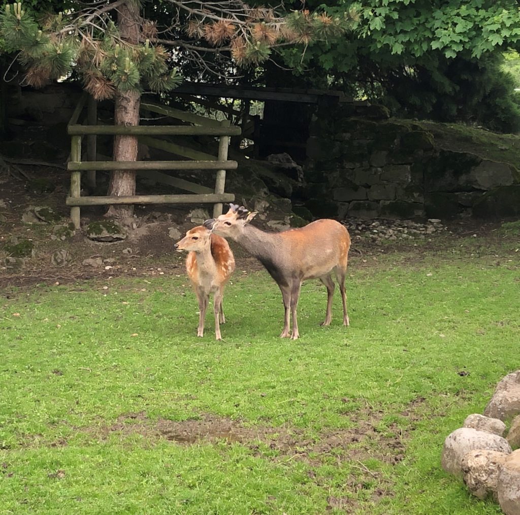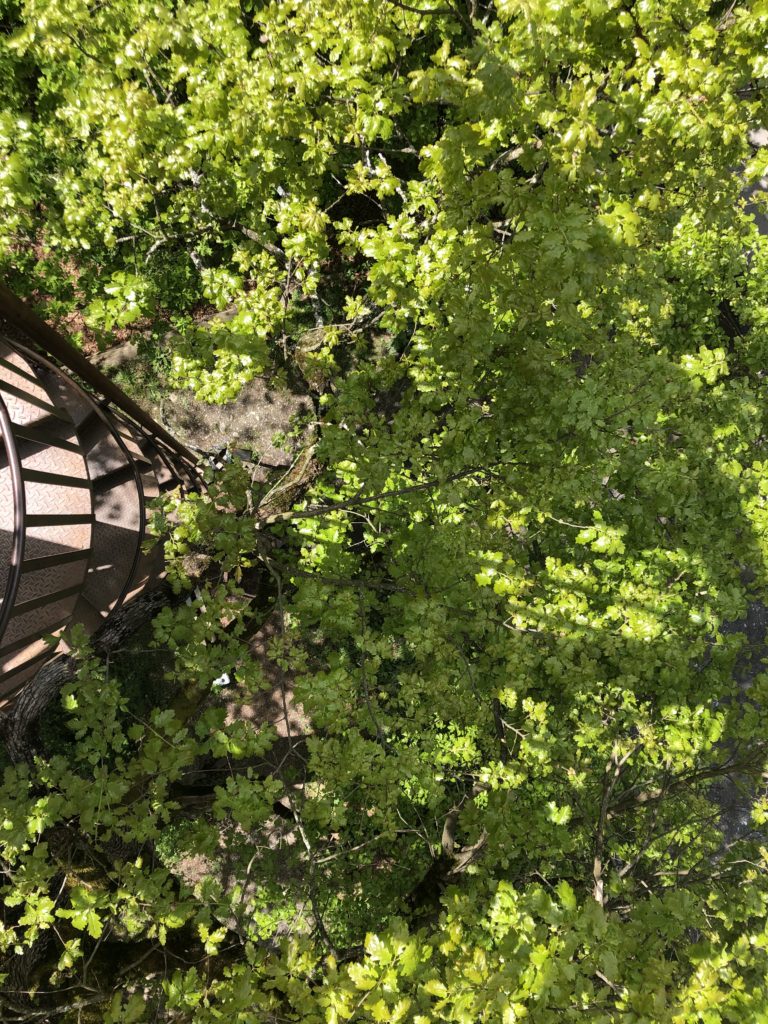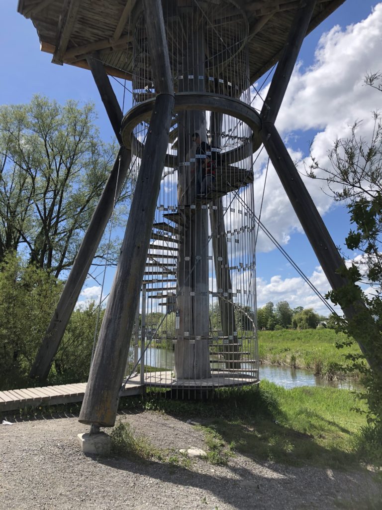 Weiter geht es nach Maienfeld (Steigstraße). Hier gibt es mehrere Parkplätze und Grillstellen (hätten wir das gewusst…) mit Bänken. Zeit für ein leckeres Eis, welches uns die Mädels ansprechend angerichtet servieren. Ein kurzer Spaziergang (mal wieder unverhofft bergauf), führt von hier zu einem Aussichtsturm neben einer alten Eiche (Eichenhaft) mit Blick in den Hain. Der angrenzenden Heidipfad erwandern wir ein anderes Mal.