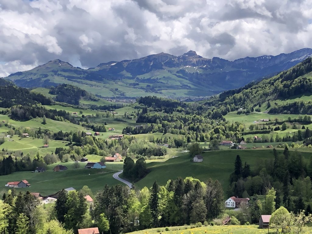 Da noch Zeit ist bis zum Mittagessen, holen wir uns an der Kasse die Unterlagen für den hier startenden Perlenweg (Stein gilt als die Perle des Appenzellerlands). Von diesem Familienweg habe ich auf der Homepage der Käserei gelesen. Der Start im Ort ist noch nicht so spannend, aber der Weg ist schön gemacht für Kinder, da sie an jeder Station Buchstaben für ihr Lösungswort finden müssen. Später geht es oberhalb des Ortes mit traumhaftem Blick auf die idyllische Landschaft und den „Säntis“ weiter. Da wieder die Sonne scheint und die Berge so einladend aussehen, beschließen wir nach dem Mittagessen spontan noch Seilbahn zu fahren. Aber erst holen wir uns die Belohnung für das Lösungswort ab – eine Perle – und kochen. Heute gibt es Gnocchi mit Rucola und Tomaten.
