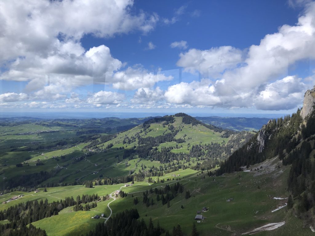 Danach fahren wir zur Talstation der Hohe Kasten Bahn in Brülisau/Rüte. Wir bezahlen für die Hin- und Rückfahrkarte insgesamt 90 CHF (die Kinder fahren kostenlos). Das ist ein stolzer Preis für den fortgeschrittenen Nachmittag, aber bei dem weiter vorherrschenden eiskalten Wind, können wir die Aussicht wohl eh nur kurz genießen. Jasmin bleibt im Womo, sie hat keine Lust und möchte lieber mal ihre Ruhe haben. Das Tragen der Maske ist das Einzige was uns an Corona erinnert, ansonsten geht es ziemlich entspannt zu. In der Gondel sind außer uns aber auch nur wenige Personen – Abstand halten kein Problem. Nach 8 Minuten Fahrt sind wir auf knapp 1800 Meter angekommen. Oben bietet sich ein atemberaubendes 360° Panorama – einen solchen Ausblick von einem Berg haben wir so noch selten erlebt. Der Berg kann komplett umrundet werden und in jede Richtung gibt es etwas anderes zu sehen. Den Bodensee, die schneebedeckten Gipfel Vorarlbergs, den Seerhein, den Säntis, ein Bergsee… Ein Traum im Sonnenschein. Wider Erwarten ist es hier oben auch recht mild und wir würden gerne länger bleiben. Aber die letzte Bahn fährt schon bald. Der Seilbahnschaffner verabschiedet uns freundlich auf Schwyzerdütsch, wie auch schon auf dem Hinweg. Überhaupt sind hier in der Schweiz alle extrem freundlich, jeder grüßt jeden, alle sind hilfsbereit. Der Parkwächter hatte uns auch extra einen großen Platz zum Parken zugewiesen.
