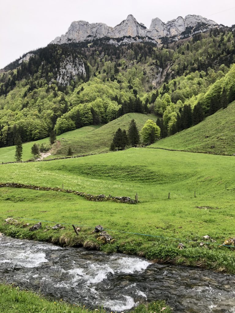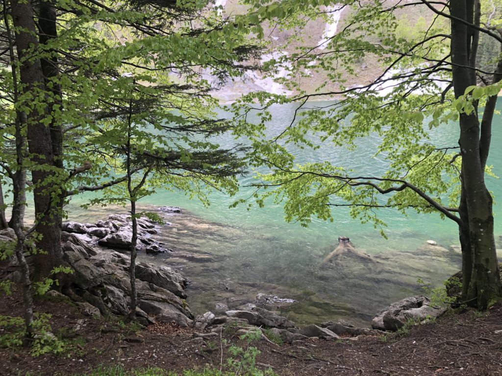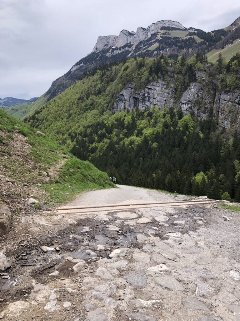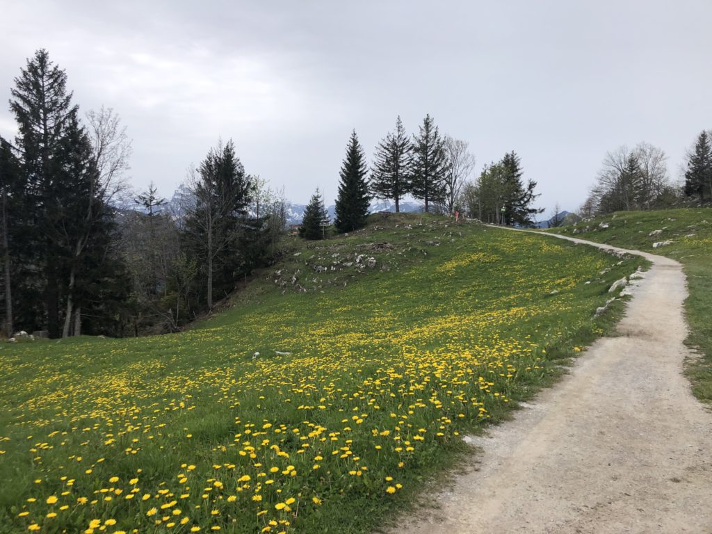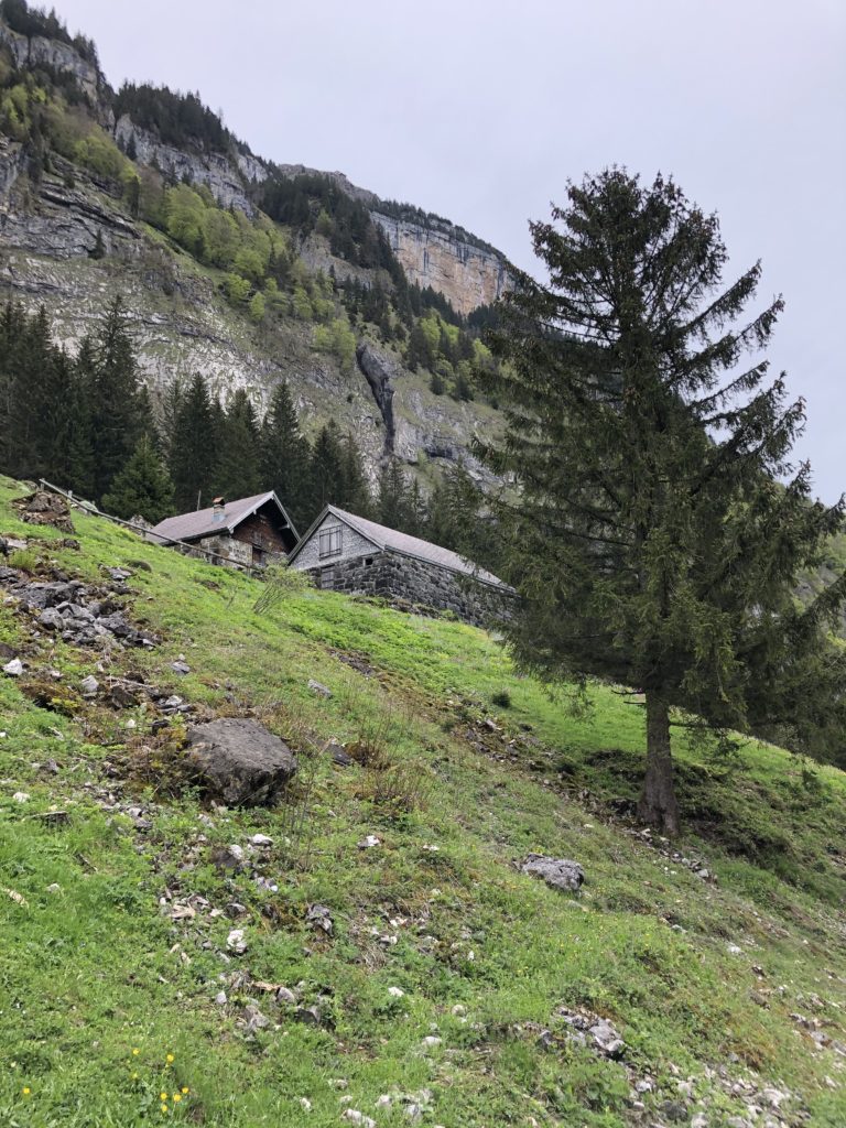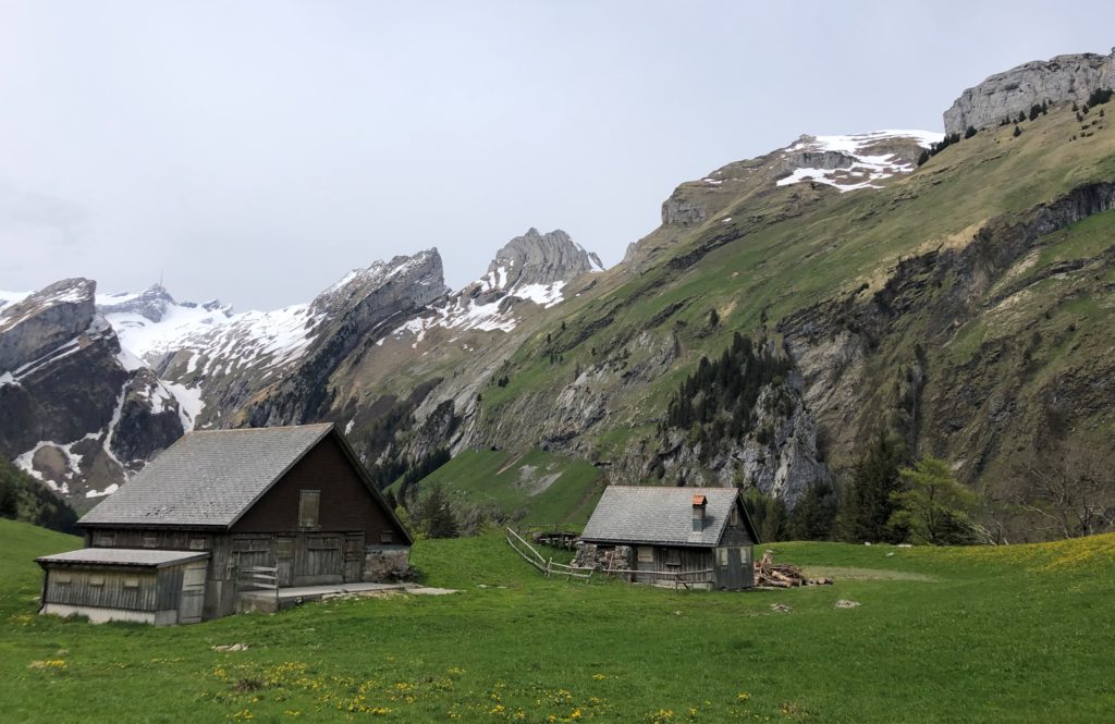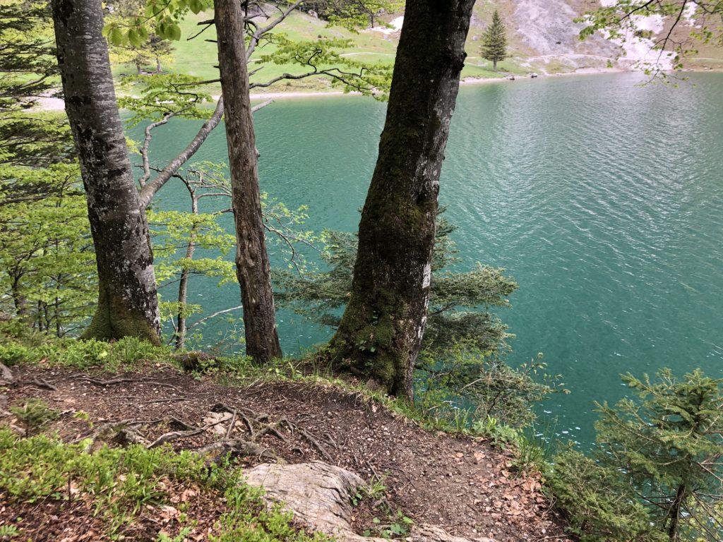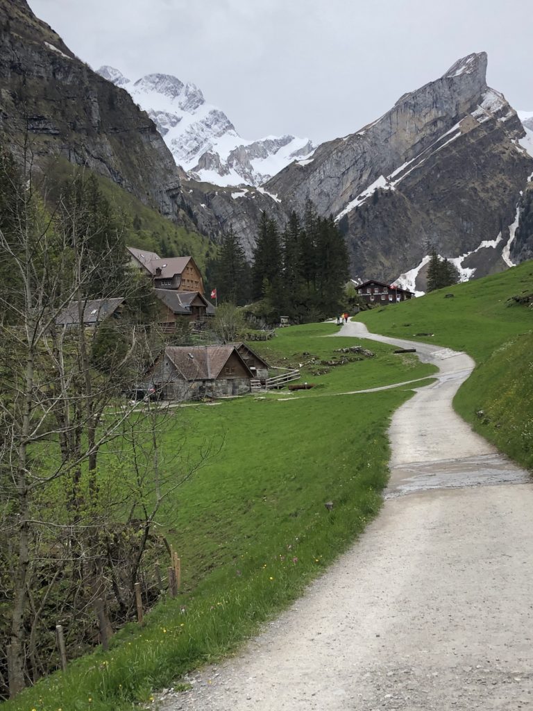 So lösen wir noch einen Parkschein für 3 Stunden (3 CHF) und wandern ins Tal Richtung Seealpsee, der mit einer Entfernung von einer Stunde angegeben ist. Da das Wetter hält, wird dieser See unser Ziel. Nach kurzer Zeit steigt der Weg allerdings steil an und entpuppt sich bald als steilster Weg (ohne Stufen) den wir je gelaufen sind (er ist auch als schwierig eingestuft). Wir laufen gefühlt im 90 Grad Winkel zum Berg. Nach 1h15min haben wir dann aber doch den See erreicht – großes Lob an die Kinder – und haben wieder einen tollen Blick auf die umliegenden Berge und den Säntis. Es ist allerdings viel zu kalt zum Verweilen, so gibt es nur eine kurze Stärkung aus Äpfeln und Keksen. Dann machen wir uns auf einem anderen Pfad auf den Rückweg. Auch dieser Weg führt mit der Zeit (logischerweise) ordentlich bergab und mit steilen Stufen an einem Wasserfall vorbei, ist allerdings viel schöner als der Hinweg, der durchgehend geteert war. Nach 2:30h sind wir zurück am Womo – Zeit für ein spätes Mittagessen (Pasta Carbonara). Kurz darauf fängt es auch an zu regnen – Glück gehabt. Es regnet sich ein und wir beschließen deshalb, das wunderschöne Appenzellerland zu verlassen.