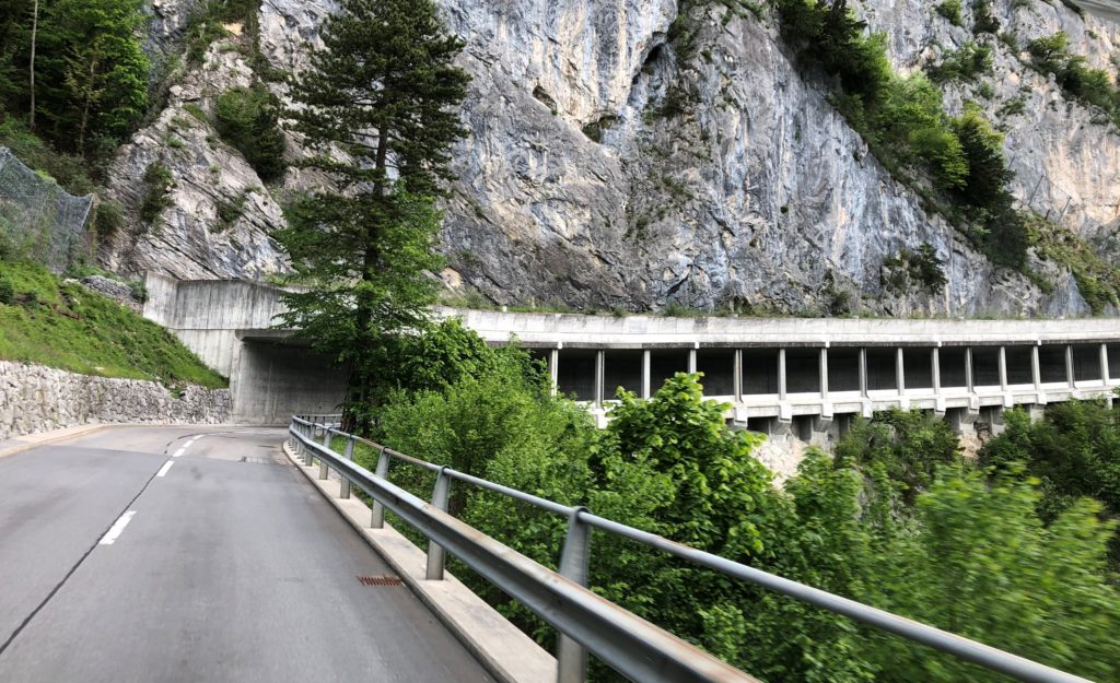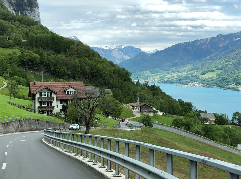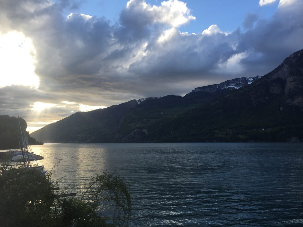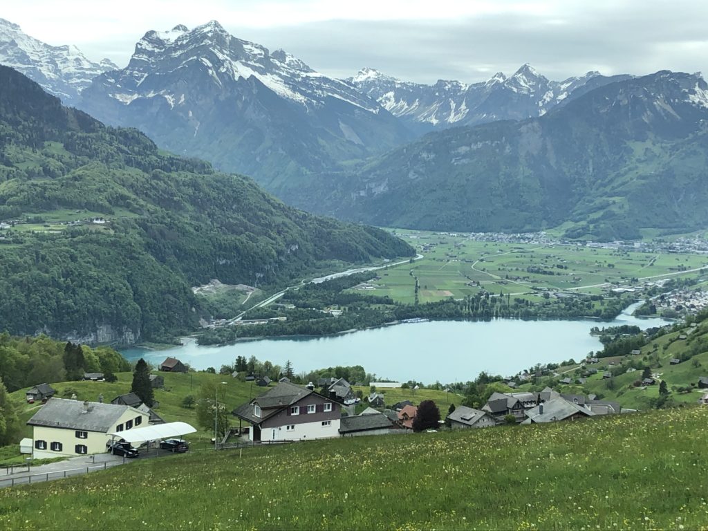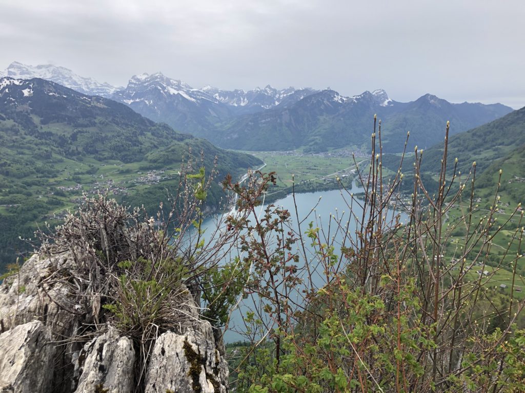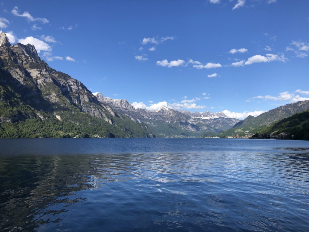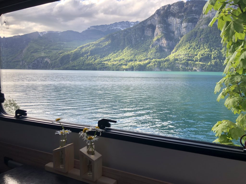 Weiter geht es ein Stück zurück und dann zum Walensee. Park4night verspricht einen einmalig schönen Stellplatz direkt am See (Bachhorn 498, Mühlehorn). Die Zufahrt ist mit unserem Lastwagenähnlichen Womo mal wieder haarig – zum Glück lässt sich Micha nicht so schnell aus der Ruhe bringen. Irgendwann haben wir es geschafft, überqueren die Gleise und sind da. Vom Esstisch aus können wir direkt aufs Wasser und die Berge schauen. Ein paar Schritte weiter ist eine Liegewiese und ein Zugang zum See sowie der Schiffsanleger. Einziger Haken an diesem kostenlosen Stellplatz sind die Zuggleise direkt nebenan. Hier rattert tatsächlich mindestens alle 15min ein Zug durch. Der Ausblick auf den Walensee und die beeindruckende Berglandschaft (oberhalb des Sees sind die Churfirsten – 5 Berge bis 2279m) machen das aber mehr als wett.