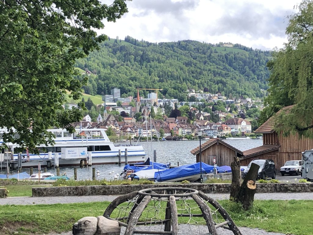 Es geht hoch hinaus nach Amden zum Parkplatz Arvenbüel (Listkammstraße/Ecke Rietstraße). Wider Erwarten ist die Straße breit ausgebaut. Micha kommt allerdings trotzdem ordentlich ins Schwitzen, da er Sorge hat, dass wir den Berg nicht hochkommen oder beim Runterfahren später die Bremsen streiken. So sind wir froh, als wir endlich oben sind und laufen vom Parkplatz ca. 20min zum Aussichtspunkt Chapf oberhalb des Walensees. Die Aussicht ist schön – besonders der 2441m hohe Mürtschenstock sticht aus der Bergkette heraus – allerdings ist das Wetter wieder sehr durchwachsen und der eisige Wind wie immer ungemütlich. Zurück am Parkplatz erkunden die Kinder noch den schönen Spielplatz, bevor wir weiter in Richtung Zürichsee fahren.