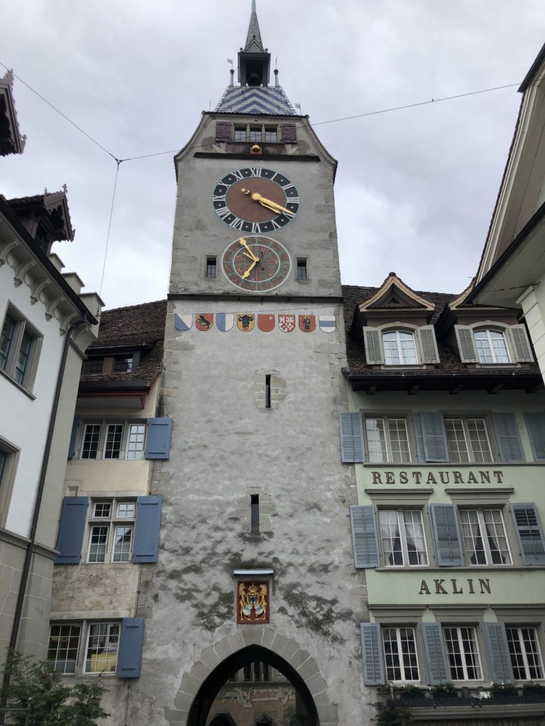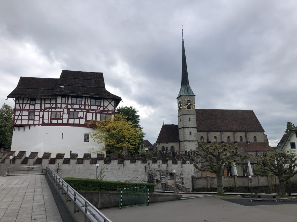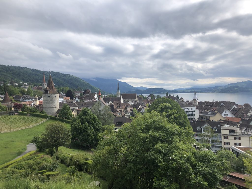 Nach dem Einkaufen hat es tatsächlich aufgehört zu regnen und wir fahren noch ein paar Kilometer weiter an den Zuger See. Vom Parkplatz am Hafen (Schilfmattweg 5) laufen wir gemütlich an der Promenade entlang ins Zentrum von Zug. Der Blick auf die Altstadt ist wunderschön und es scheint tatsächlich trocken zu bleiben. Die Kinder erkunden die Spielplätze, während wir am Wasser sitzen. Wir betrachten die Ausflugsschiffe und Vogelvolieren und genießen den Nachmittag. Dann spazieren wir zur Zuger Burg und weiter zum Aussichtspunkt Guggi. Gut, dass wir ein Parkticket für 3 Stunden (= 3 CHF) gelöst haben. So können wir noch ein bisschen die Sonne genießen, die sich immer mehr durchsetzt.