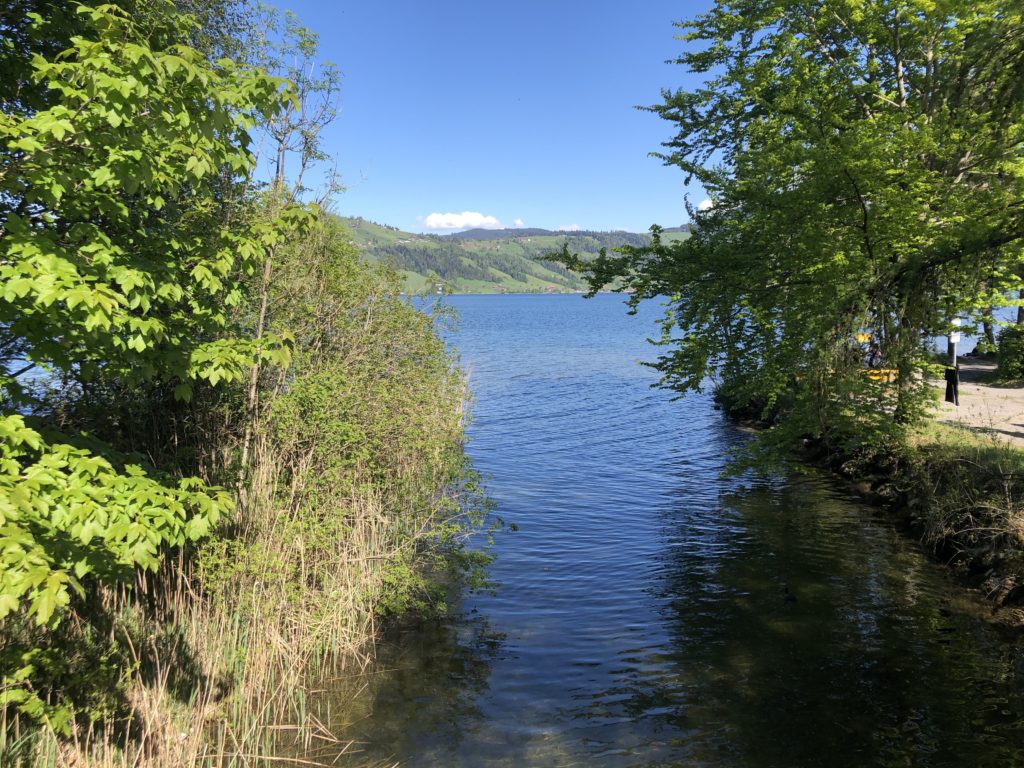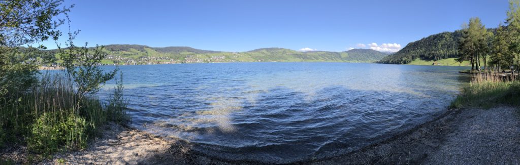 Zum Abschluss unserer Reise wünschen sich die Kinder endlich eine Nacht auf dem Campingplatz und eine Fahrt mit dem Stand Up Paddle. Also fahren wir nach Unterägeri an den Ägerisee, den wir auch schon vom Zugerberg aus durchblitzen haben sehen. Wir hätten von oben auch direkt hierher wandern können – vielleicht nächstes Mal 😊. Der Campingplatz Unterägeri ist schon komplett ausgebucht, aber der sehr nette Chef macht alles möglich und für uns eine Ausnahme und lässt uns auf die Zeltwiese stehen. Die Übernachtung kostet 53 CHF – übliche Schweizer Preise. Da wir fast die ganze Woche kostenlos übernachtet haben, können wir das aber gut verschmerzen.