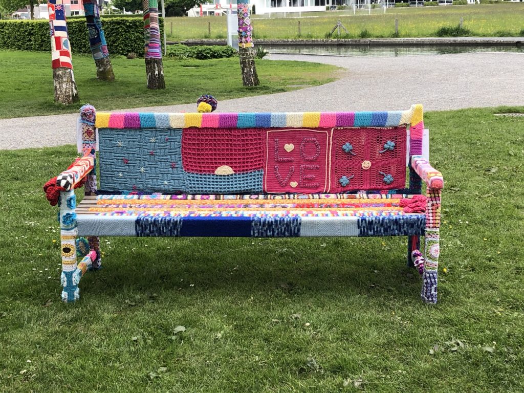 Im Laufe des Abends sind noch 2 Zelte auf der Wiese dazu gekommen, aber weit genug weg, so dass wir uns platztechnisch nicht einschränken müssen. Es ist mal wieder bewölkt, aber zumindest relativ mild und trocken, so dass wir auch draußen frühstücken können. Sofia und Luki holen Weckle und Zopf vom Campingbäcker. Nach dem Frühstück wollen alle wieder auf den Spielplatz und Micha und ich machen einen Morgenspaziergang in den Ort. An der Promenade und im Birkenwäldi sind überall Gegenstände in Wolle und Garn eingekleidet. Das Projekt nennt sich „Ägeri Farbig“ und soll in Corona Zeiten für einen bunten Lichtblick sorgen. 1133 gestrickte Quadrate sind verteilt und kleiden Bäume, Brückengeländer und sogar eine Parkbank. Mittendrin steht auch ein Wunschbaum. Sehr schöne Idee. Am See entlang spazieren wir zurück zum Campingplatz, packen zusammen und fahren Richtung Heimat.