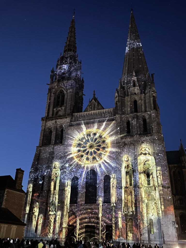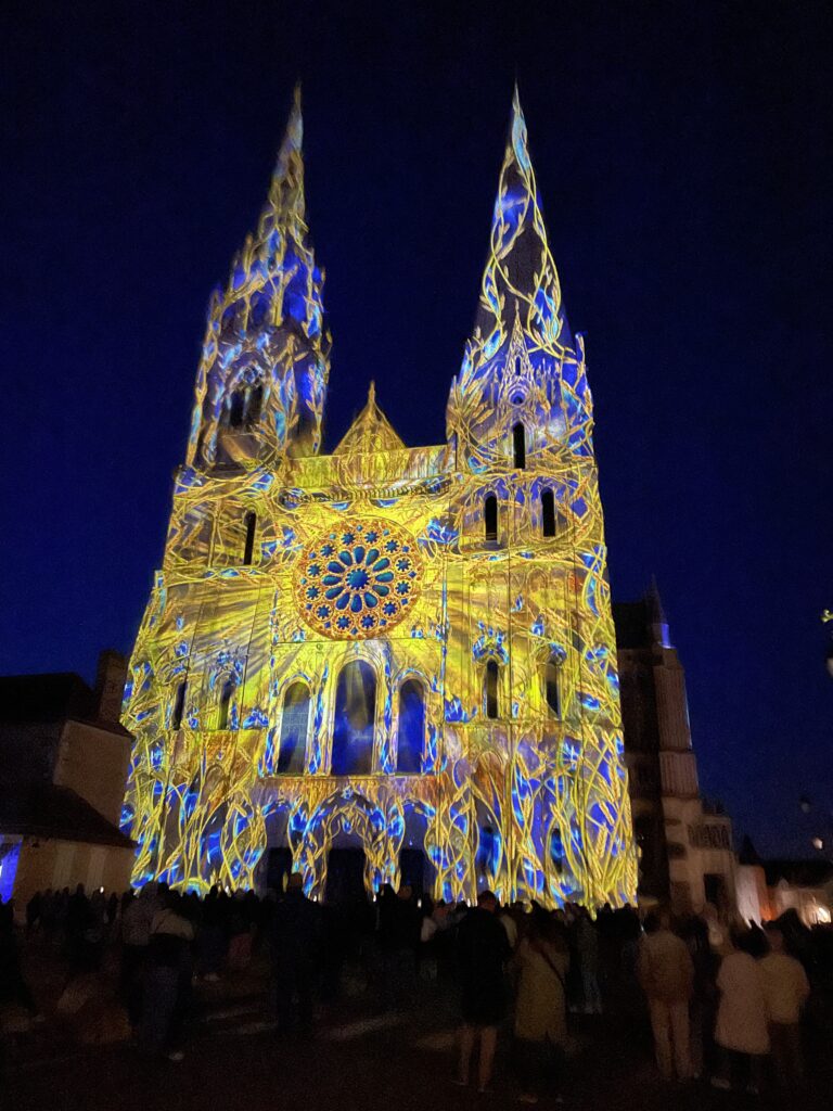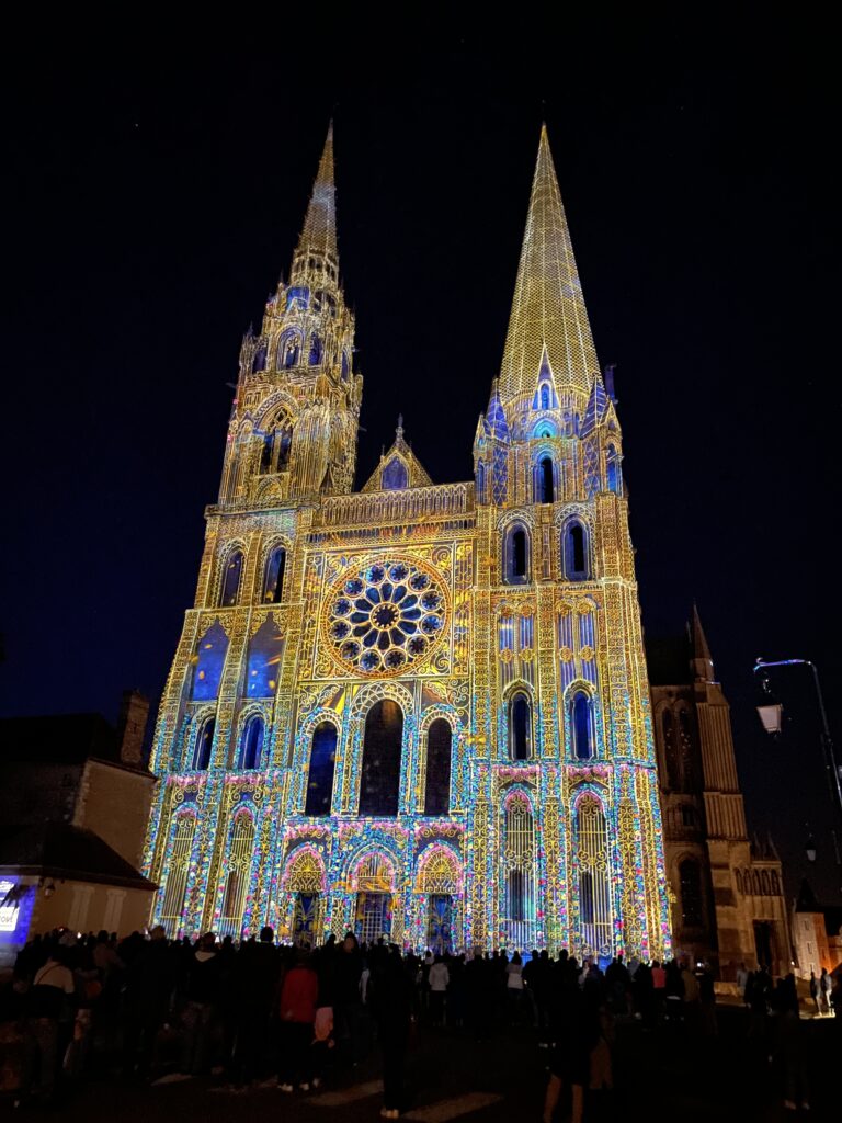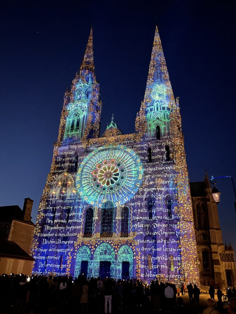 Nach einem heißen Getränk zum Aufwärmen in einem Café ist es dann fast 21 Uhr. Gegen 22 Uhr kann man täglich für eine Stunde „Chartres en lumière“ bewundern – dieses Jahr zum 20. Jubiläum. An mehr als 20 Stellen in der Stadt werden Lichtinstallationen auf die Fassaden und Brücken projiziert. Hotspot ist die Hauptfassade der Kathedrale mit animierten Bildern und passender Musik. Das schauen wir uns für eine halbe Stunde an und sind danach durchgefroren und müde. Bis wir zurück am Wohnmobil sind, ist es dann wieder spät geworden – 23:30 Uhr.
