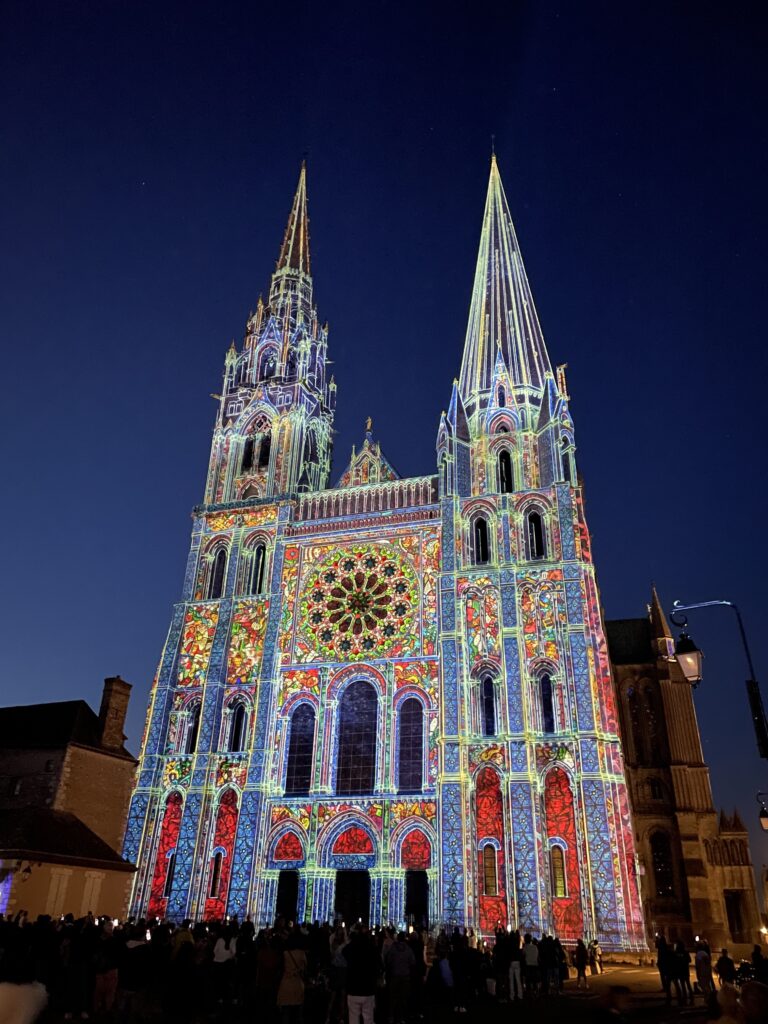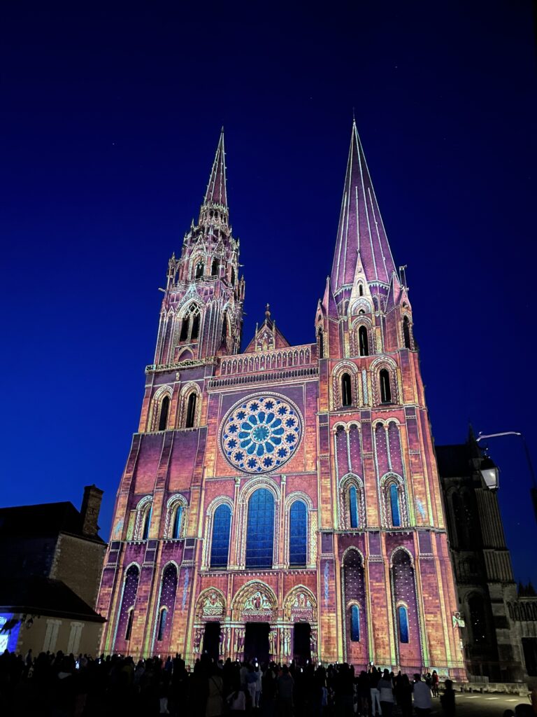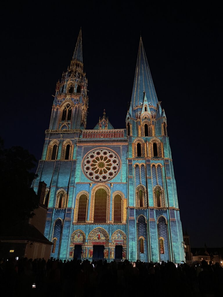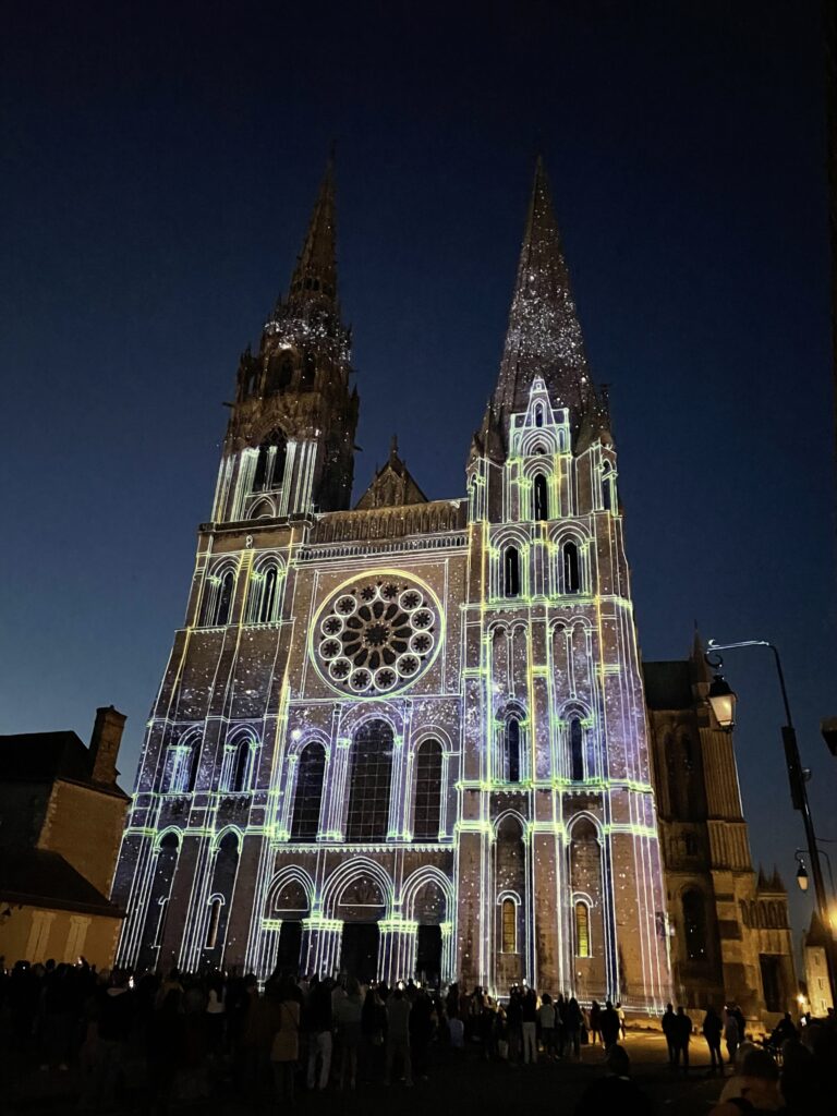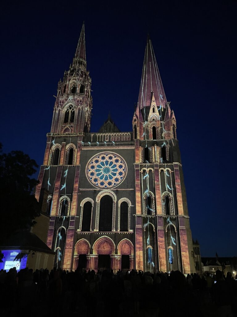 Nach einem heißen Getränk zum Aufwärmen in einem Café ist es dann fast 21 Uhr. Gegen 22 Uhr kann man täglich für eine Stunde „Chartres en lumière“ bewundern – dieses Jahr zum 20. Jubiläum. An mehr als 20 Stellen in der Stadt werden Lichtinstallationen auf die Fassaden und Brücken projiziert. Hotspot ist die Hauptfassade der Kathedrale mit animierten Bildern und passender Musik. Das schauen wir uns für eine halbe Stunde an und sind danach durchgefroren und müde. Bis wir zurück am Wohnmobil sind, ist es dann wieder spät geworden – 23:30 Uhr.