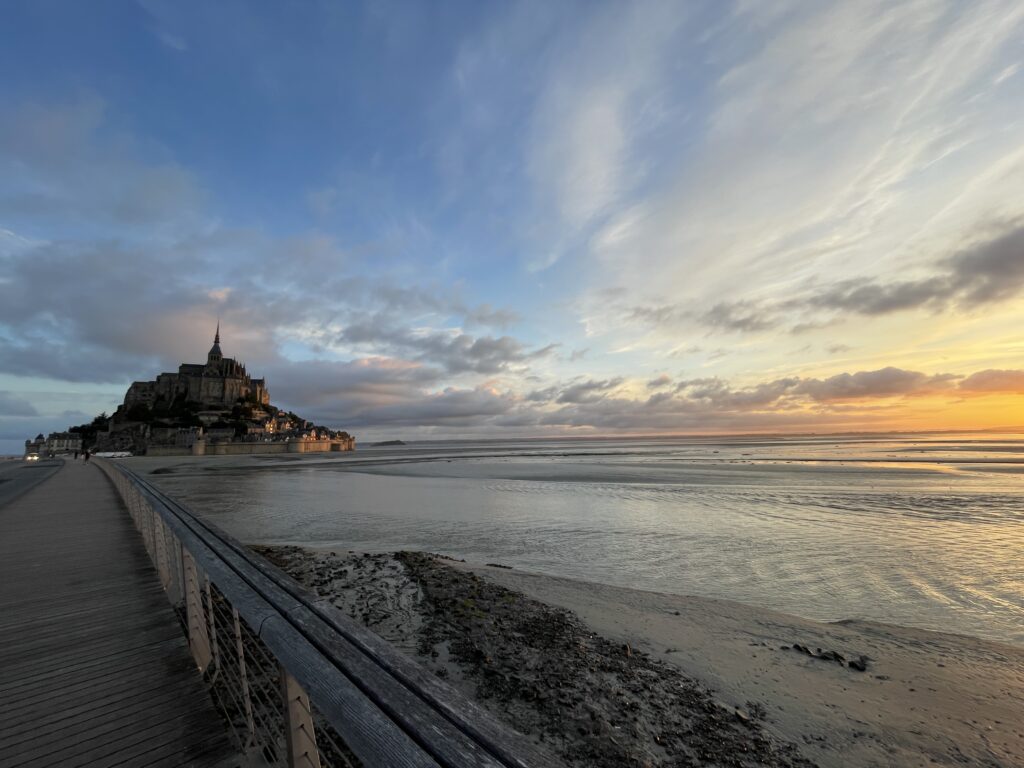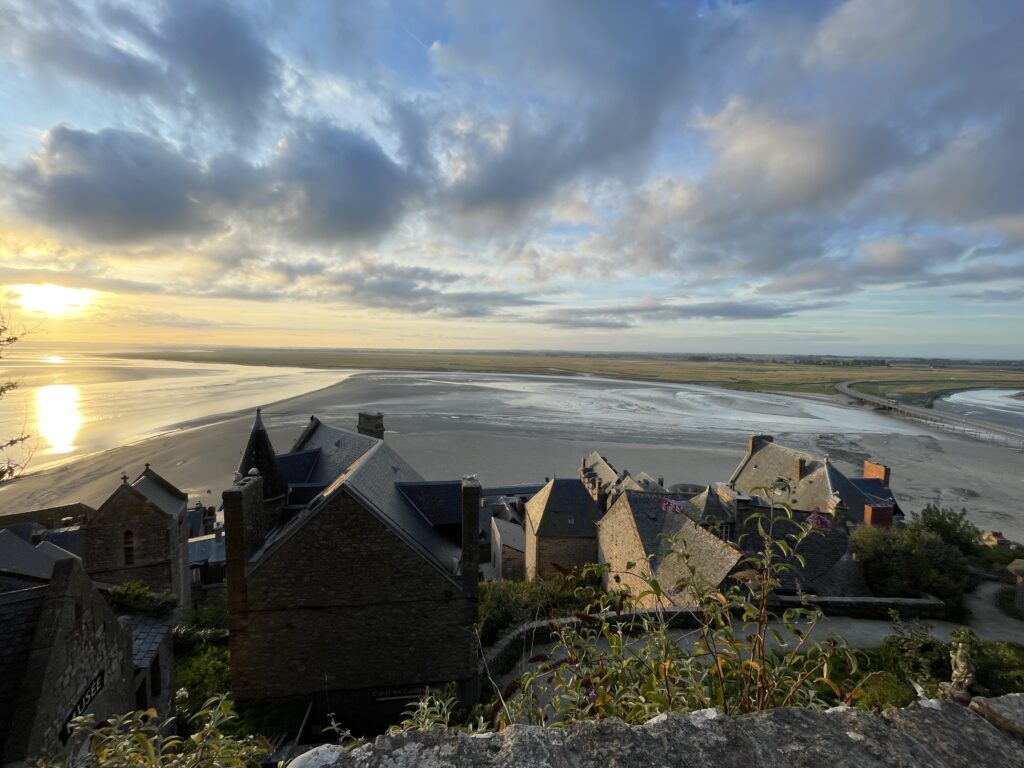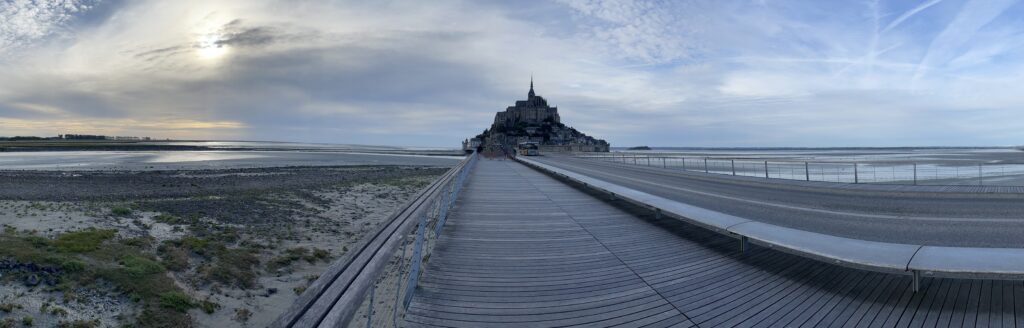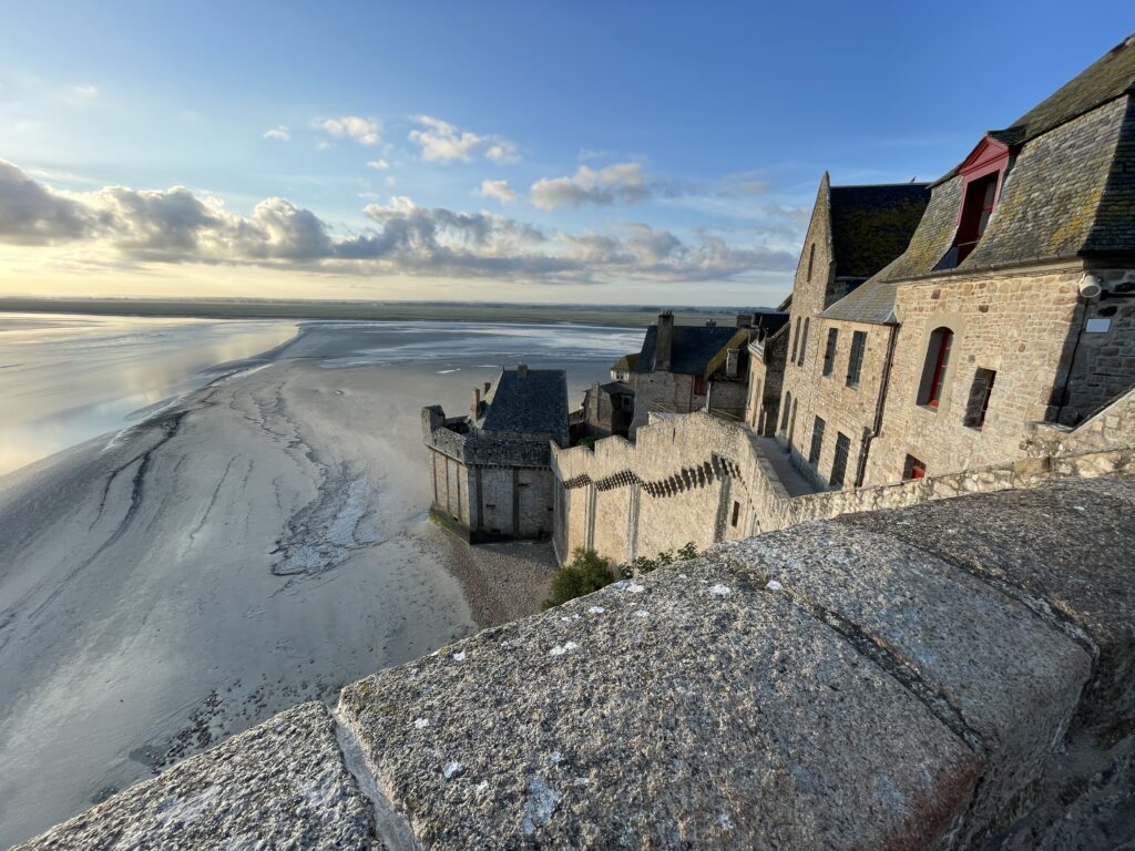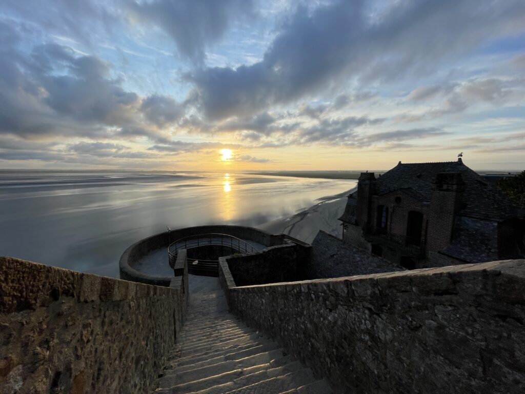 Morgenstund hat Gold im Mund und den Mont Saint-Michel für sich, deshalb bin ich heute schon um kurz vor halb 7 mit dem E-Scooter aufgebrochen und habe den Klosterberg pünktlich zum Sonnenaufgang erreicht. Mit mir sind um diese Zeit nur eine Handvoll Menschen unterwegs – auf der Brücke bin ich sogar ganz alleine. Auf der Insel selbst treffe ich dann nur Einheimische, die alles für einen neuen Tag voll Menschenmassen vorbereiten – überall wird geputzt und vor allem Unmengen von Müll entsorgt. Noch können sich die Möwen an den Essensresten der Touristen bedienen. Auf dem Wehrgang herrscht eine unglaubliche Stimmung – nur das Kreischen der Möwen und das Rauschen des Meeres ist zu hören.