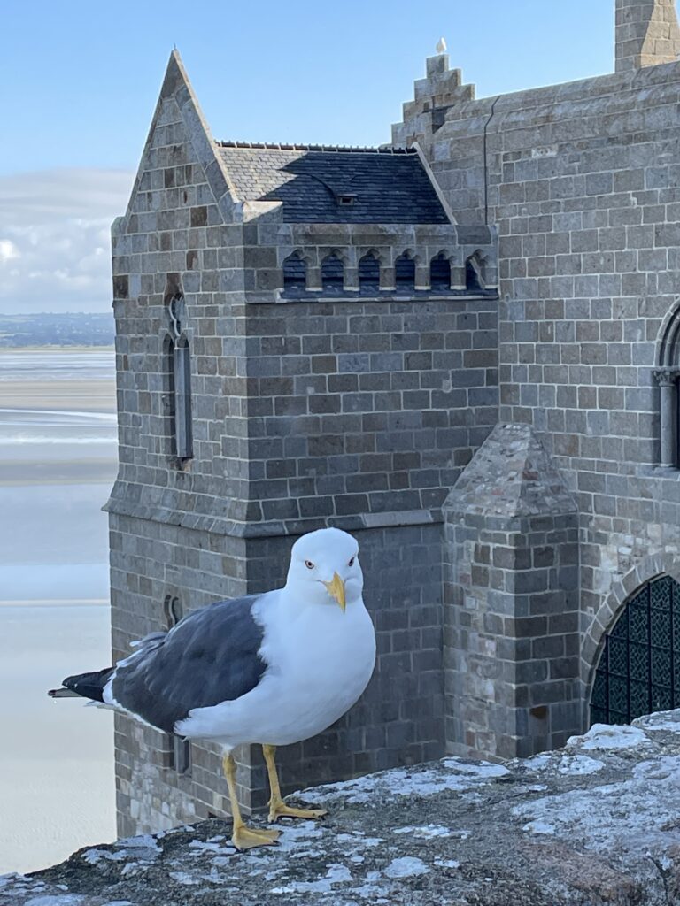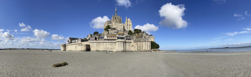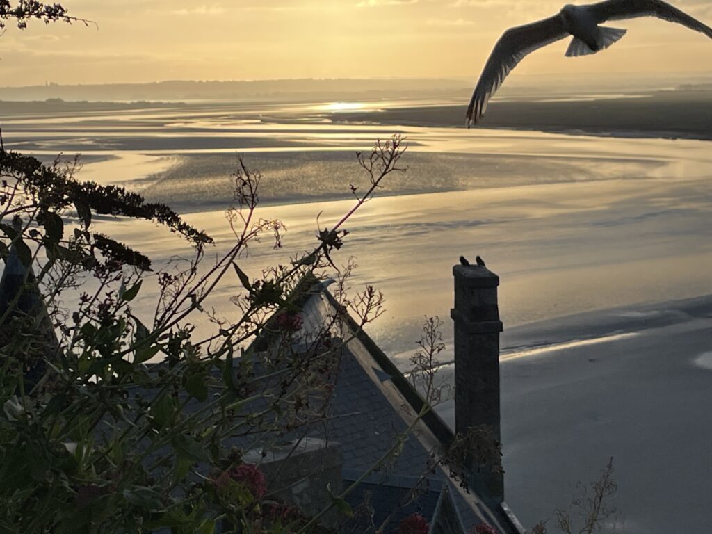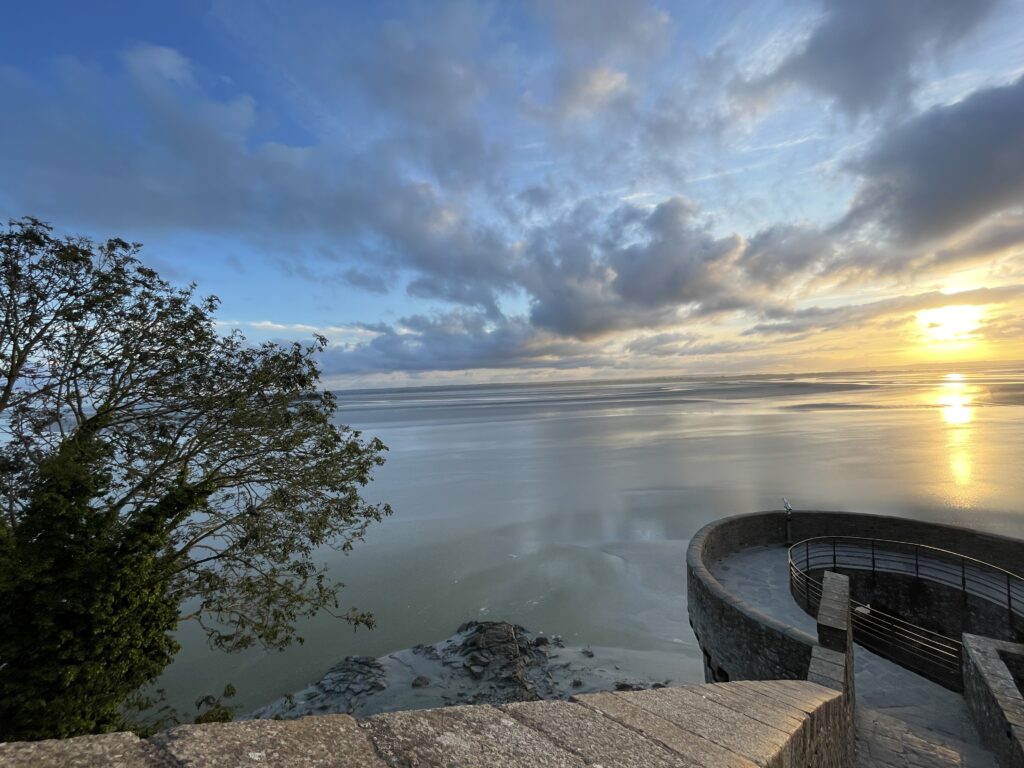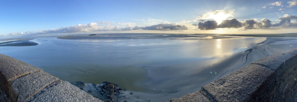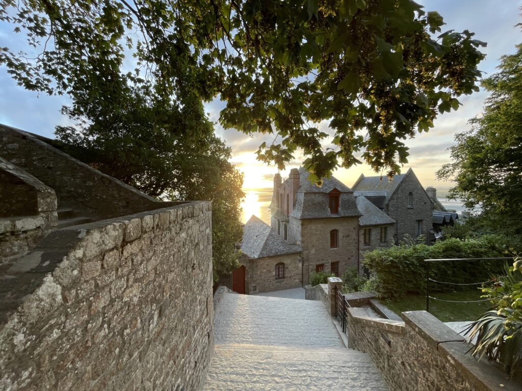 Morgenstund hat Gold im Mund und den Mont Saint-Michel für sich, deshalb bin ich heute schon um kurz vor halb 7 mit dem E-Scooter aufgebrochen und habe den Klosterberg pünktlich zum Sonnenaufgang erreicht. Mit mir sind um diese Zeit nur eine Handvoll Menschen unterwegs – auf der Brücke bin ich sogar ganz alleine. Auf der Insel selbst treffe ich dann nur Einheimische, die alles für einen neuen Tag voll Menschenmassen vorbereiten – überall wird geputzt und vor allem Unmengen von Müll entsorgt. Noch können sich die Möwen an den Essensresten der Touristen bedienen. Auf dem Wehrgang herrscht eine unglaubliche Stimmung – nur das Kreischen der Möwen und das Rauschen des Meeres ist zu hören.