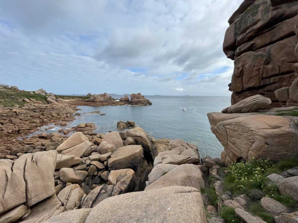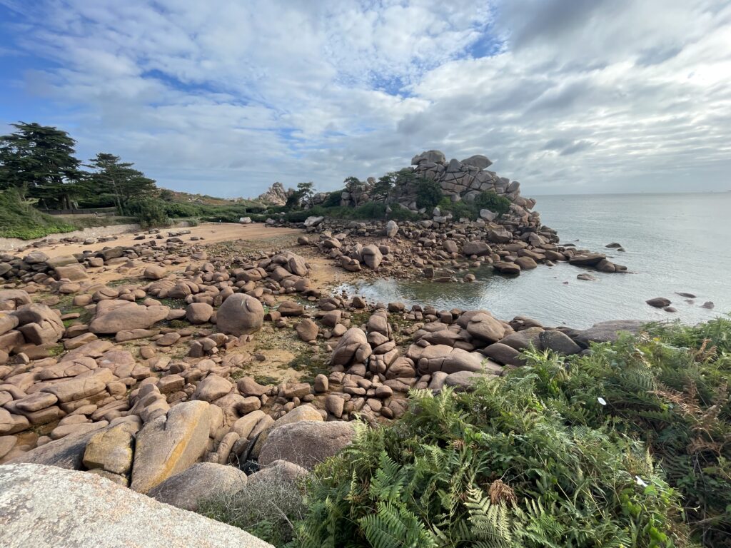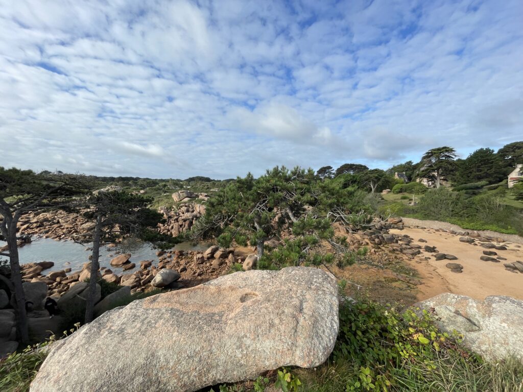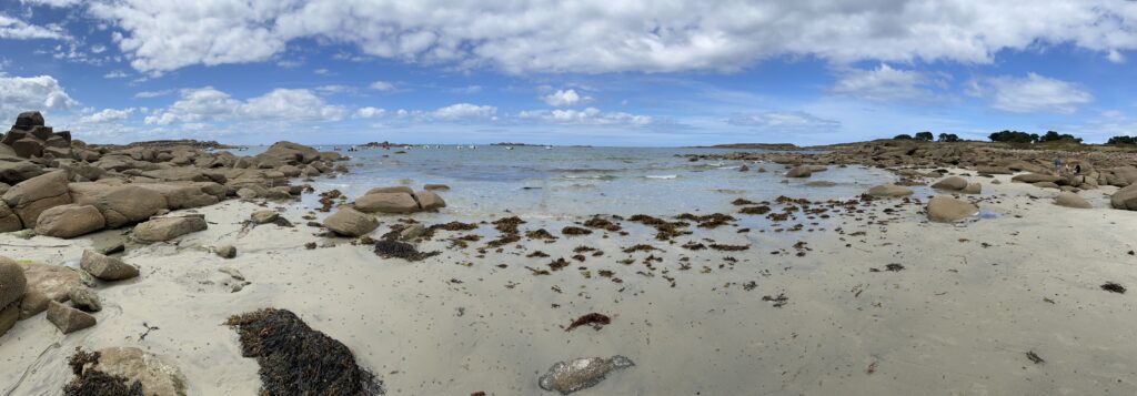 Wir wollen uns ein schönes Plätzchen zum Kochen suchen. In Trégastel ist unglaublich viel los, also schnell wieder weiter. Fündig werden wir dann am Strand „Plage de Landrellec“ in Pleumeur-Bodou. Hier können wir unser Mittagessen und Eis nochmals inmitten der Granitküste genießen. Die Sonne scheint und wir überlegen, noch eine Weile hier am Strand zu bleiben, aber das Wasser ist mal wieder eisig und schon schieben sich auch wieder Wolken vor die Sonne.