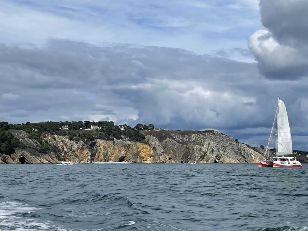 Die nahe Straße war gestern bis spät abends und seit frühmorgens zu hören, aber sonst gibt es eigentlich nichts an diesem Parkplatz auszusetzen. Nach dem Frühstück fahren wir über die große Brücke Pont de Térénez auf die „Presqu’île de Crozon“ nach Morgat, da wir hier online für den Nachmittag eine Bootstour gebucht haben (Vedettes sirens). Wir parken kostenlos neben dem Wohnmobil-Stellplatz (48.225304, -4.513062), da dieser noch voll belegt ist. Bei näherer Betrachtung würden wir auch nicht übernachten wollen. Die Womos stehen dicht an dicht auf Beton und die Plätze sind so eng, dass man nicht einmal Tisch und Stühle rausstellen könnte.