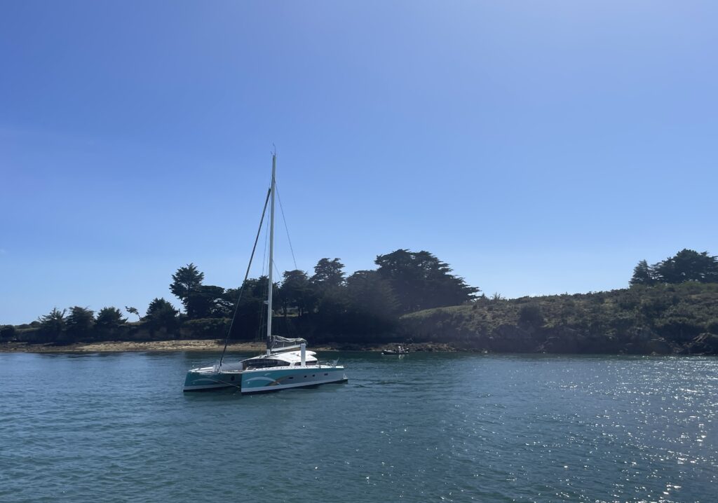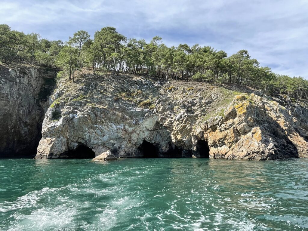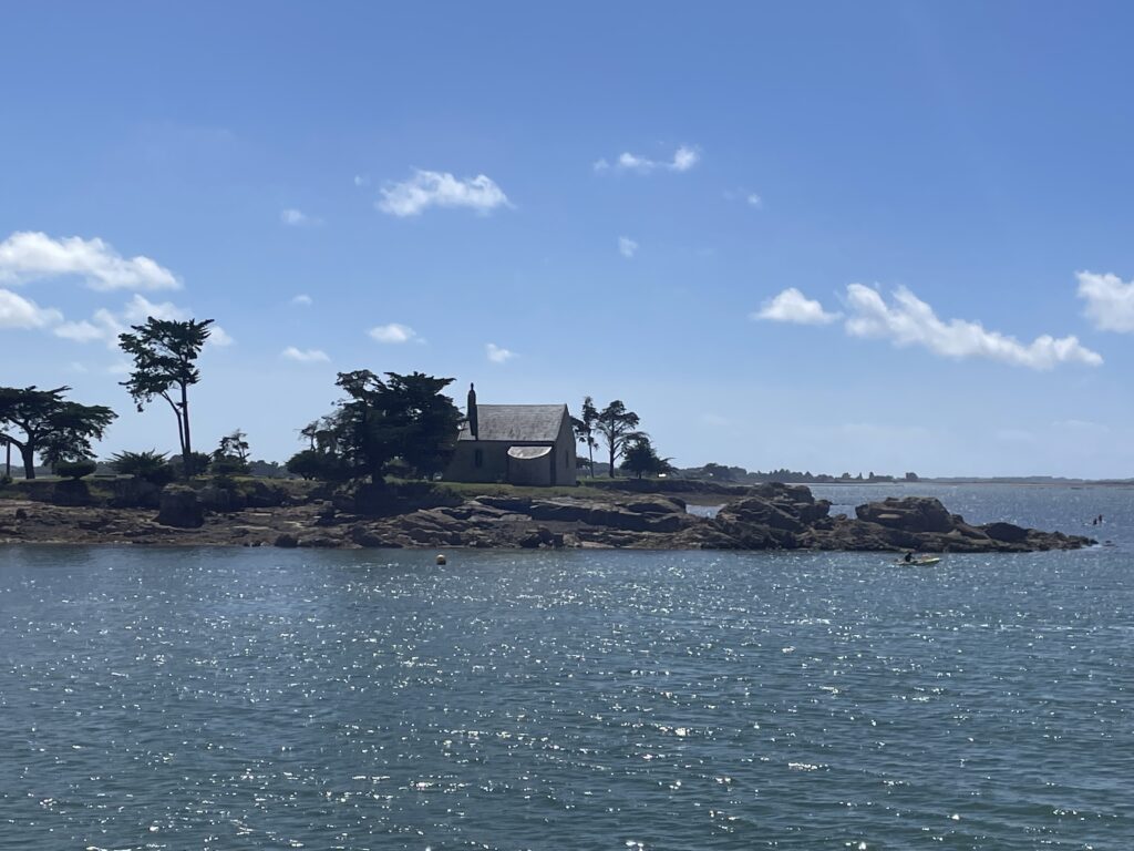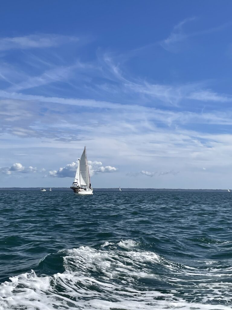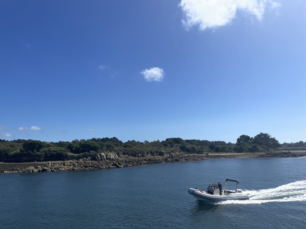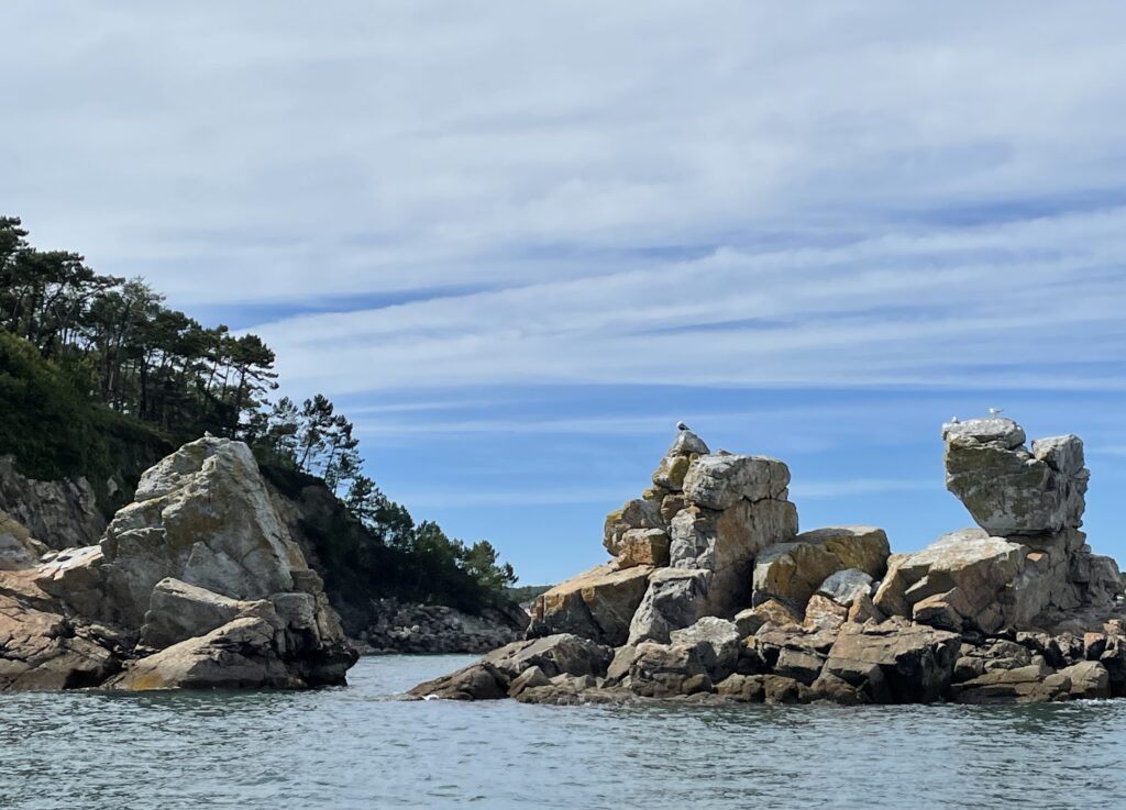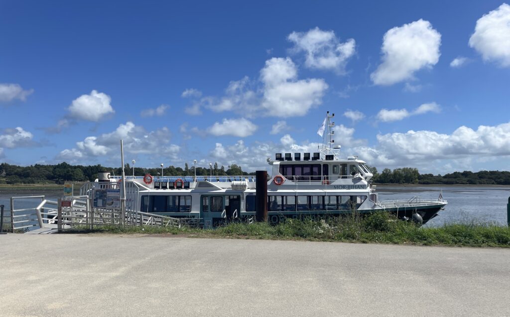 Für 14:30 Uhr haben wir online eine 3stündige Schifffahrt durch den Golfe du Morbihan (wir sind mittlerweile auch im Département Morbihan =bretonisch für ‚kleines Meer‘ angekommen) gebucht (Reederei Navix). Es geht im Schneckentempo vorbei an den unzähligen kleinen und größeren Inseln bis zum offenen Meer und auf selbem Weg zurück. Uns wurde eine Fahrt durch eine der schönsten Buchten der Welt versprochen. Die Bucht und die Inseln sind schon sehr schön, aber durch das langsame Tempo und denselben Hin- und Rückweg wird es nach einiger Zeit leider sehr langweilig. Dazu kommen Kosten von 24,60€ für Erwachsene und 20,40€ für Kinder über 13 – zu viel für das Gebotene. Zumindest das Wetter ist toll heute und perfekt für die Schifffahrt und wir haben ein Plätzchen an Deck ergattert.