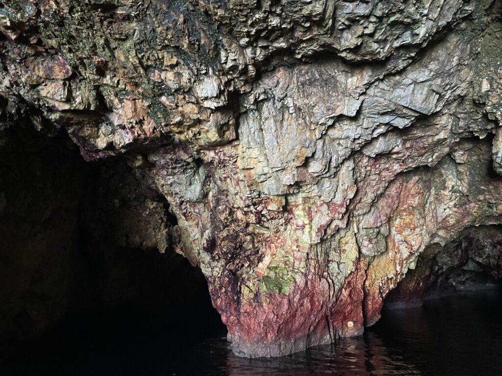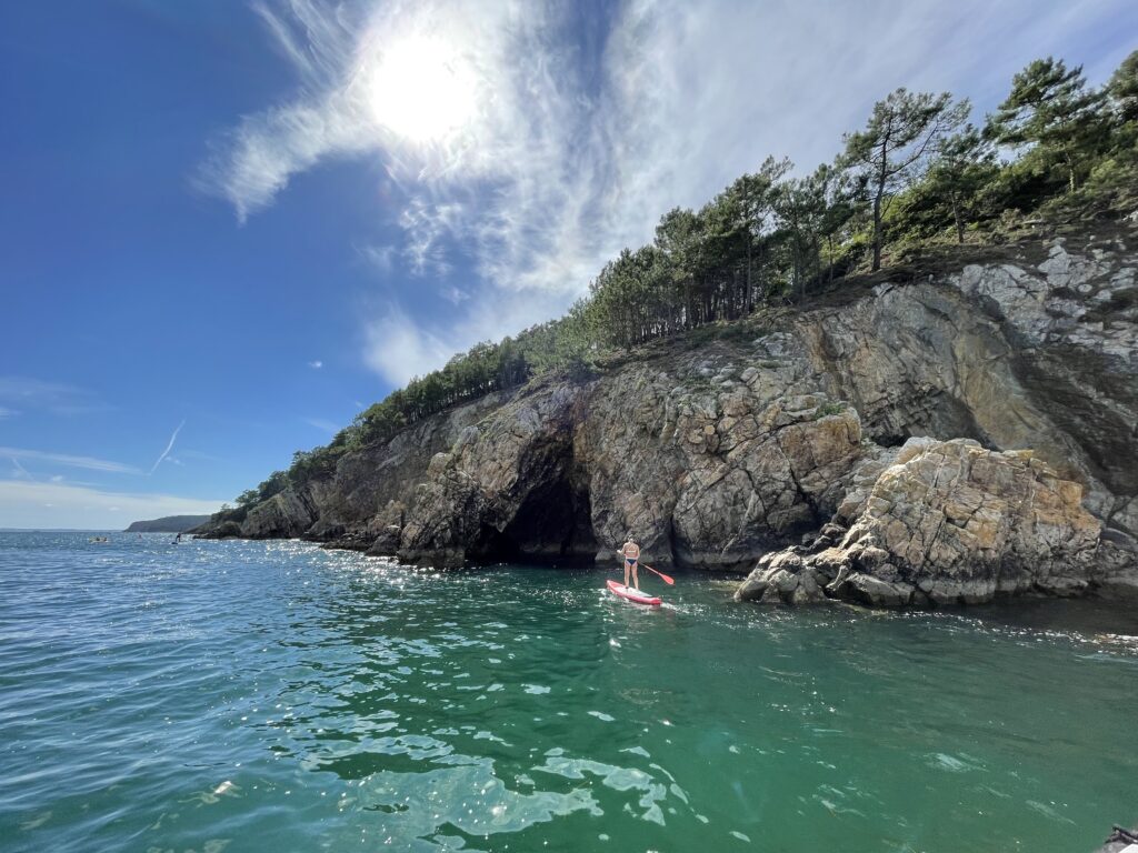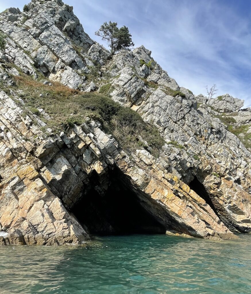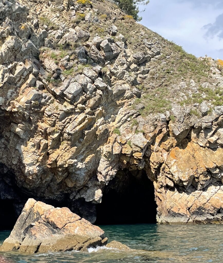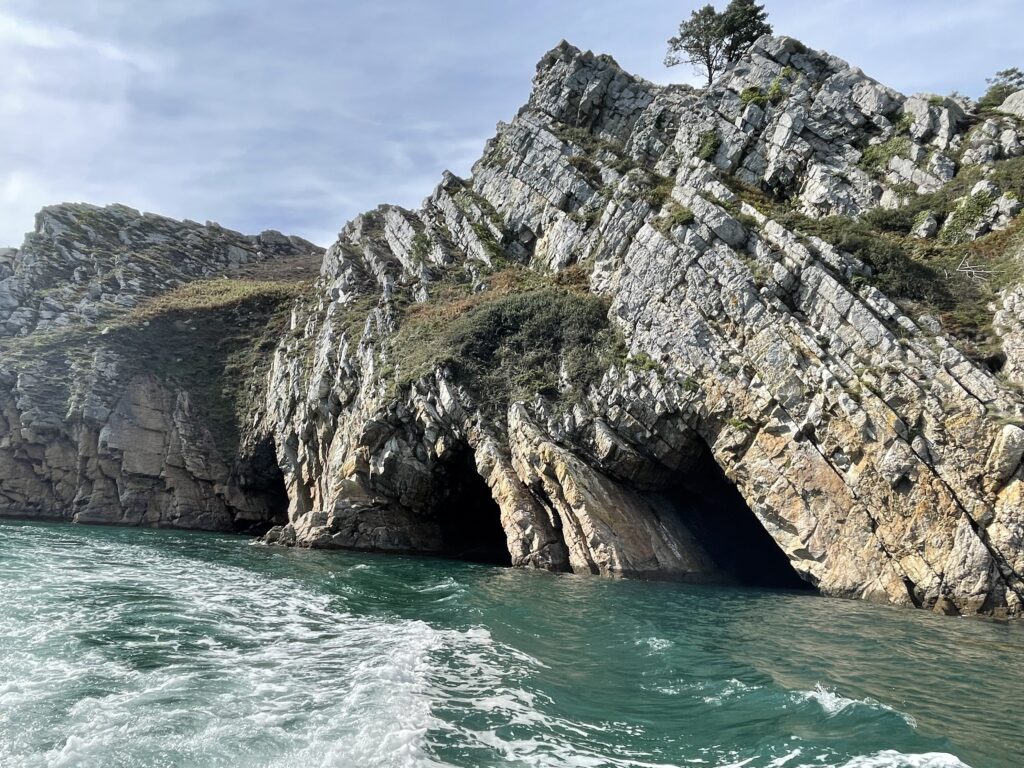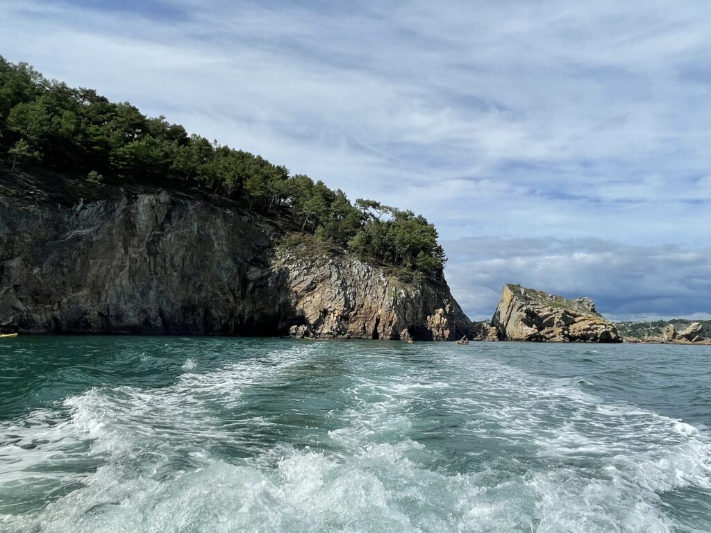 Um 16:30 Uhr startet dann die 50minütige Bootstour zu den Grotten von Morgat (16€ p.P., Luki 10€), wo man sehr gut die Gesteinsschichten der Halbinsel – Sandstein und Schiefer – sehen kann. In der Grotte de l’Autel sind sie Wände sogar mehrfarbig (Oxidation von Eisen = rote Färbung, Flechten = grün). Die Crew erzählt jede Menge Wissenswertes, allerdings nur auf französisch und rasend schnell gesprochen, so dass auch Jasmin und ich nur einzelne Brocken verstehen. Alles in allem ein netter Ausflug und das Beste: die Sonne strahlt heute Nachmittag vom Himmel, perfekt für unsere Tour. Da heute Feiertag ist, gibt es auch einen kleinen Rummel und Marktstände an der Promenade und abends soll noch Livemusik spielen. Es ist unglaublich viel los – zu viel für unseren Geschmack, also nichts wie raus aus dem Trubel.