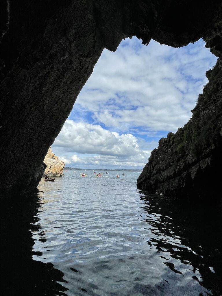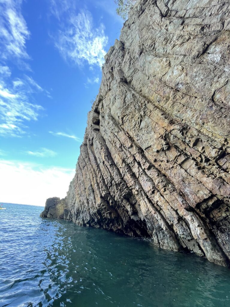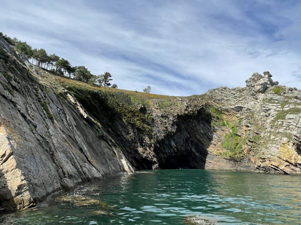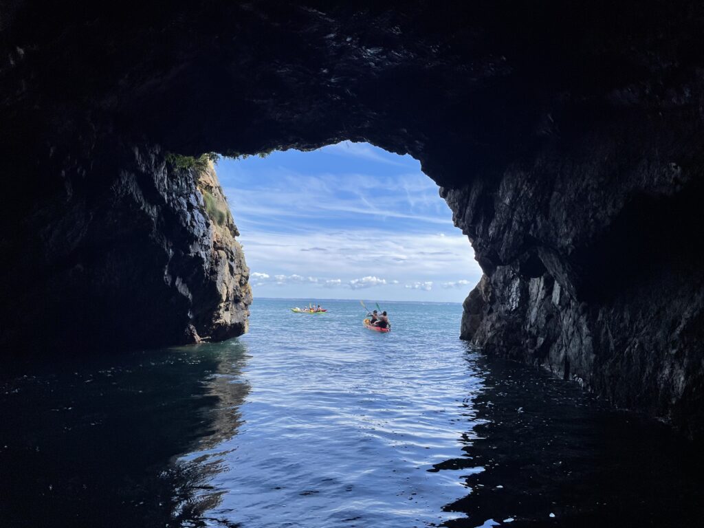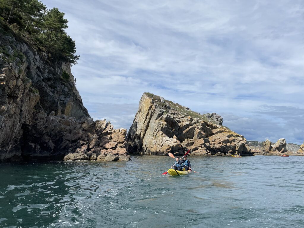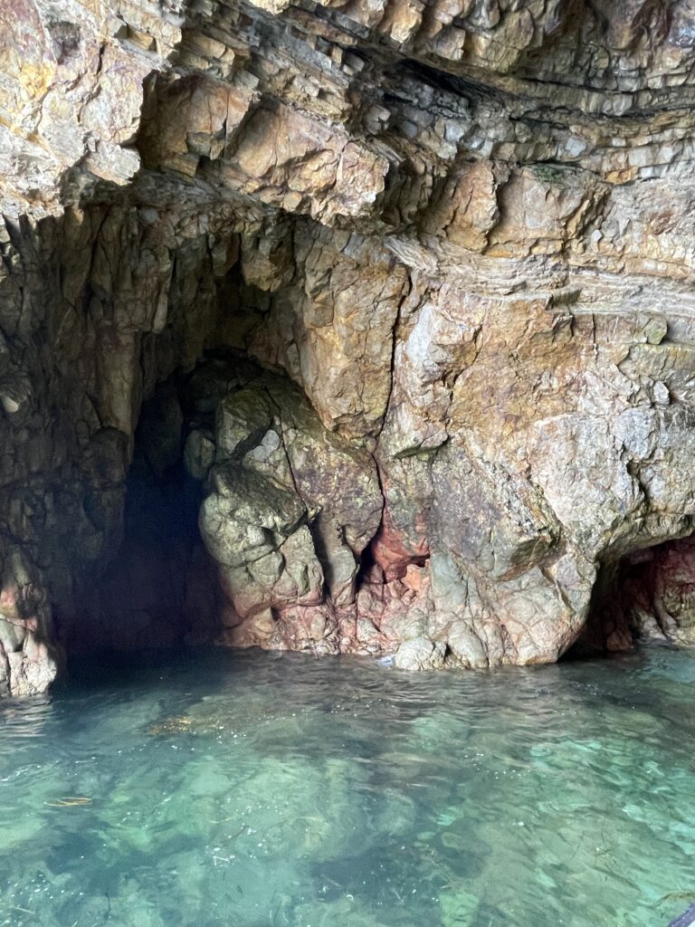 Um 16:30 Uhr startet dann die 50minütige Bootstour zu den Grotten von Morgat (16€ p.P., Luki 10€), wo man sehr gut die Gesteinsschichten der Halbinsel – Sandstein und Schiefer – sehen kann. In der Grotte de l’Autel sind sie Wände sogar mehrfarbig (Oxidation von Eisen = rote Färbung, Flechten = grün). Die Crew erzählt jede Menge Wissenswertes, allerdings nur auf französisch und rasend schnell gesprochen, so dass auch Jasmin und ich nur einzelne Brocken verstehen. Alles in allem ein netter Ausflug und das Beste: die Sonne strahlt heute Nachmittag vom Himmel, perfekt für unsere Tour. Da heute Feiertag ist, gibt es auch einen kleinen Rummel und Marktstände an der Promenade und abends soll noch Livemusik spielen. Es ist unglaublich viel los – zu viel für unseren Geschmack, also nichts wie raus aus dem Trubel.