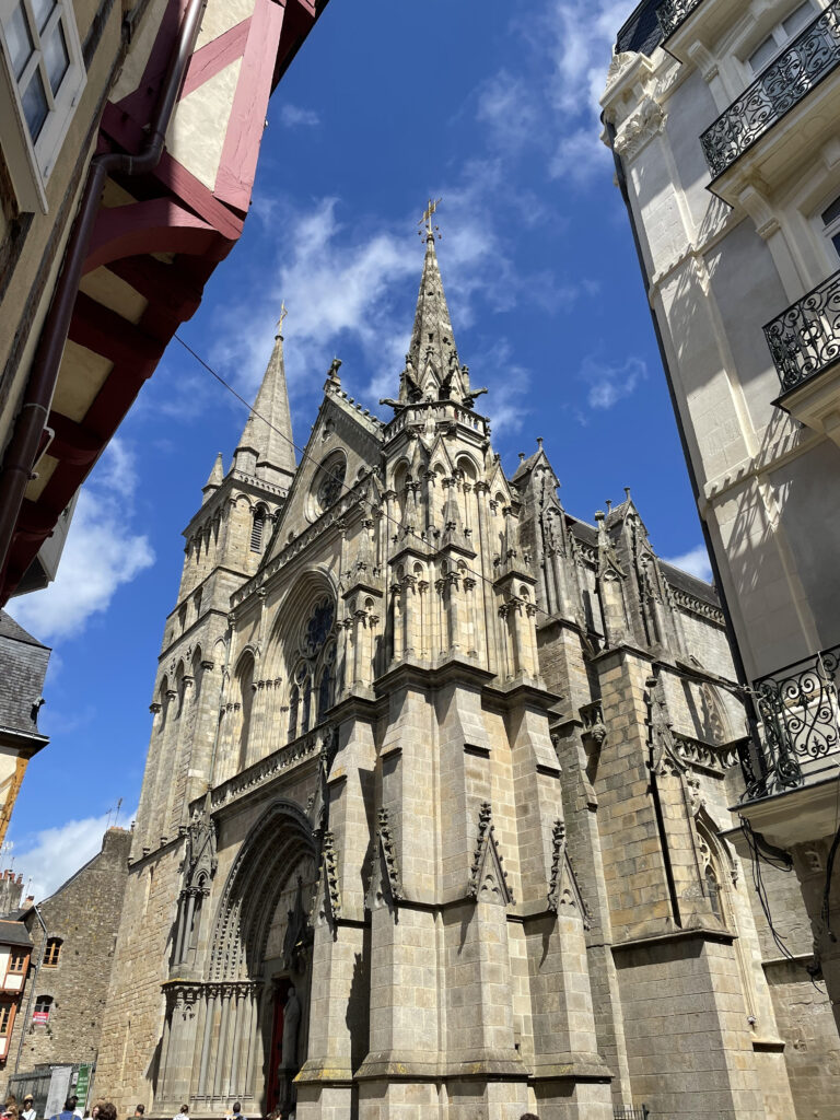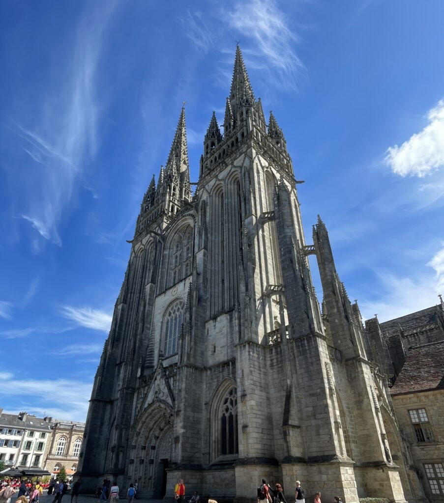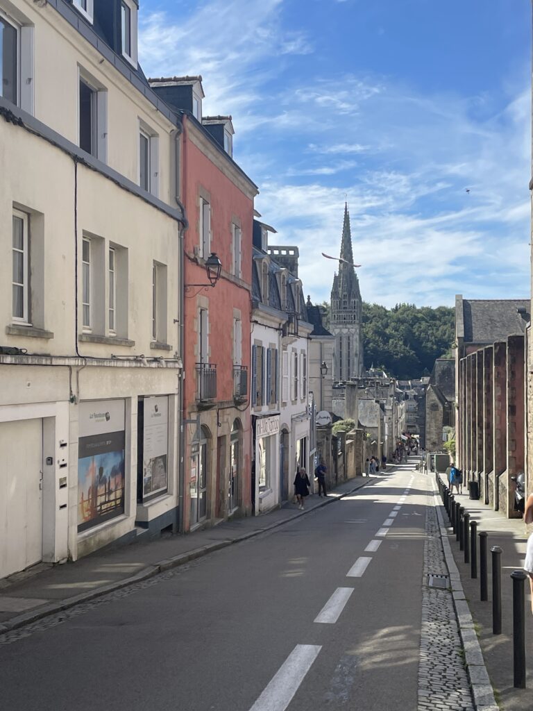 Weiter geht es nach Quimper, einer der schönsten Städte in der Bretagne am Fluss Odet mit einer wunderschönen Altstadt. Die Zufahrt zum kostenlosen Parkplatz gestaltet sich sehr schwierig, da wieder viel zu schmal für unser großes Gefährt (48.0006, -4.1002, wenige Plätze für Wohnmobile). Wir spazieren durch die vielen Gassen und probieren in einer Crêperie zum ersten Mal bretonische Galettes (Pfannkuchen aus Buchweizenmehl). Während wir in der Rue Salé auf einen freien Tisch warten, besichtigen wir noch die Cathedrale Saint-Corentin, die aber von außen deutlich ansehnlicher ist als von innen.