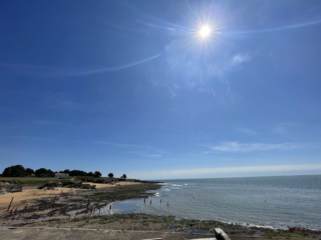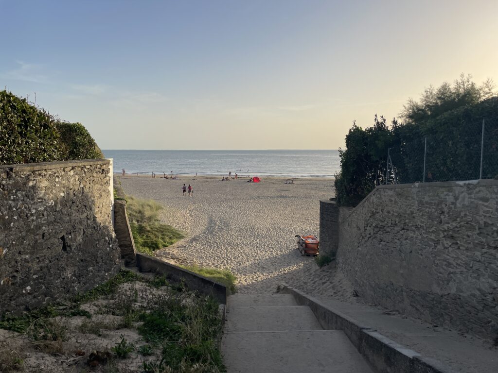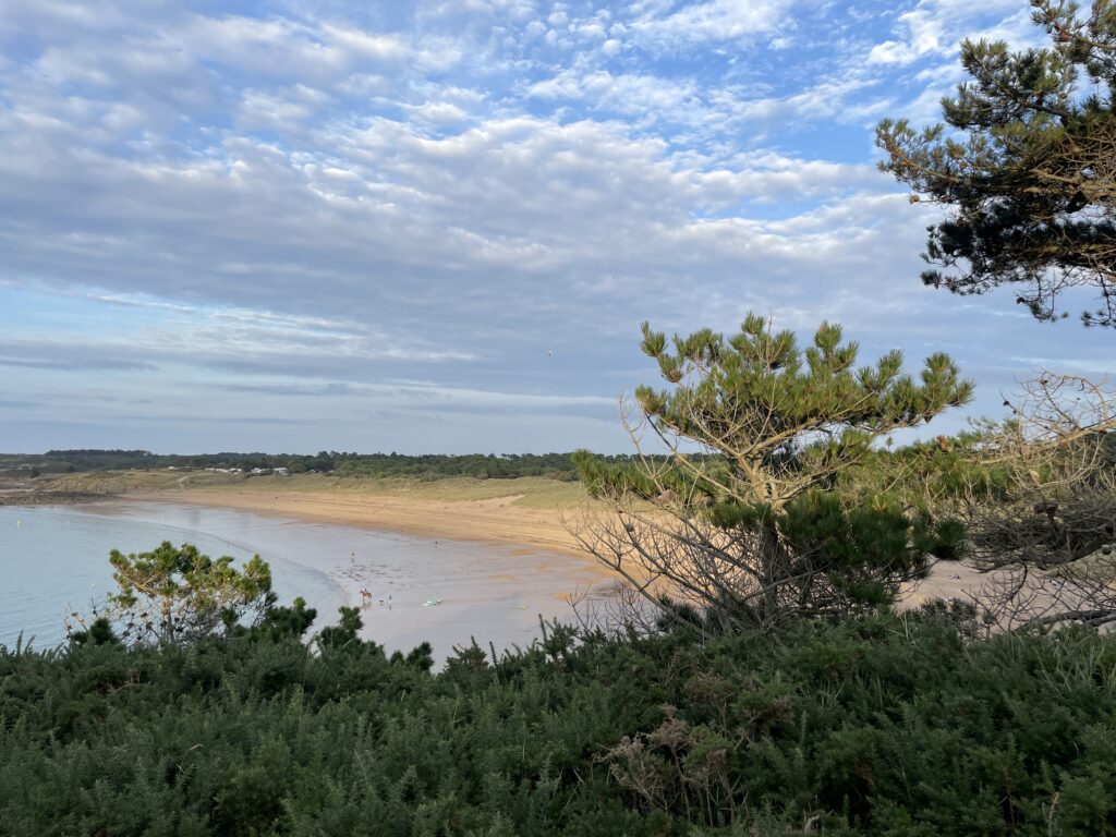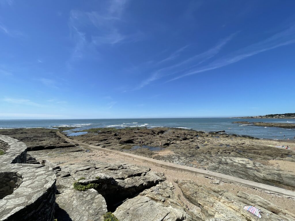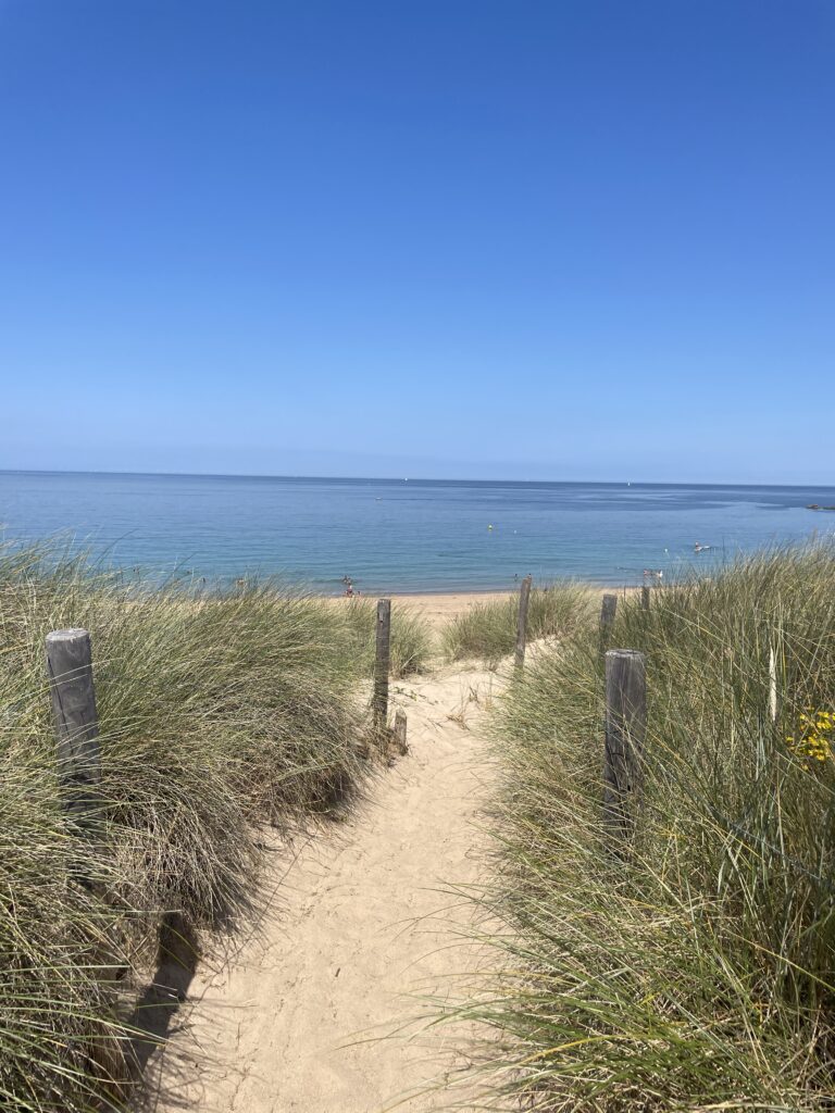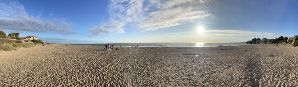 Am Campingplatz vorbei geht es zum Plage de la Manchette. Es ist Flut und das Wasser lockt uns. Wie erwartet ist der Atlantik aber eiskalt und es weht ein frischer Wind, daher traut sich nur Micha rein, uns anderen reicht die Abkühlung an den Füßen. Nach einem kurzen Sonnenbad zieht sich das Meer auch schon langsam wieder zurück und wir können zur nächsten Bucht Plage de la Pissotte spazieren und Muscheln suchen.