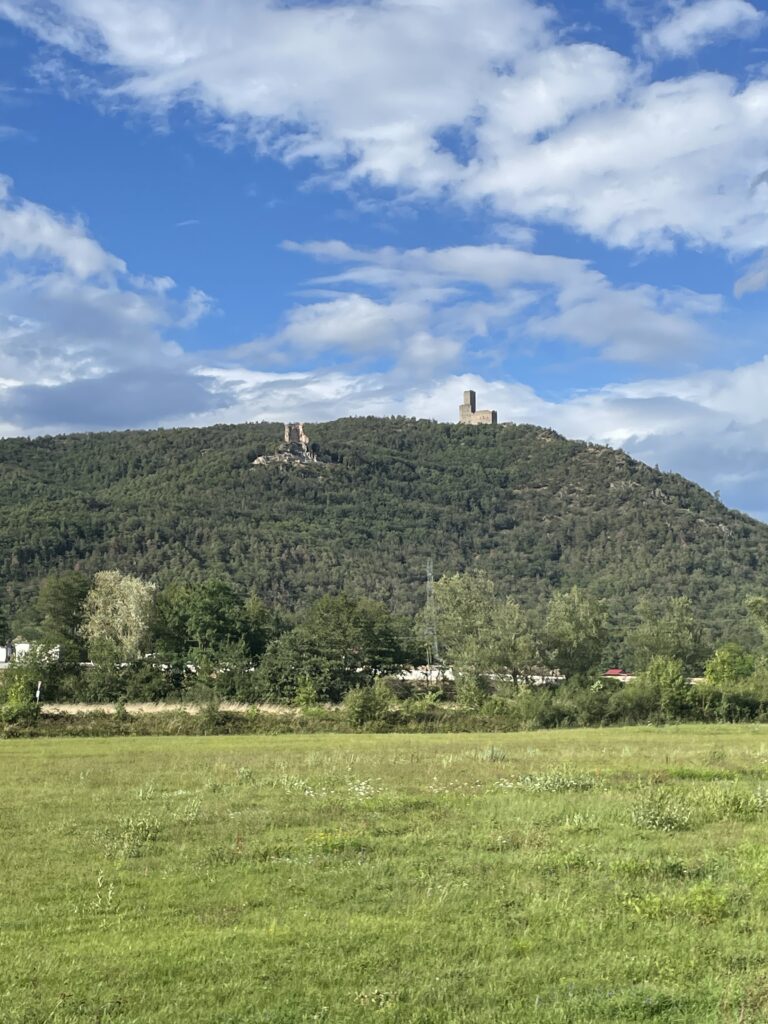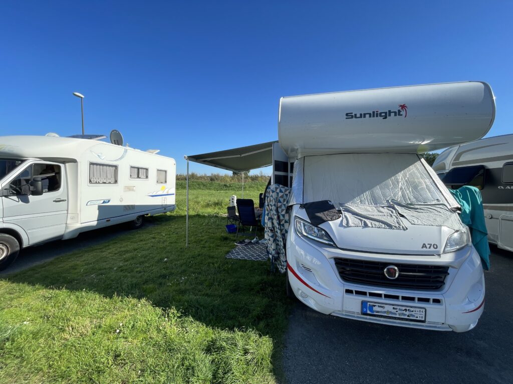 Nach einer ruhigen Nacht ist es morgens endlich mal richtig warm und wir können im T-Shirt gemütlich draußen frühstücken – herrlich. Eigentlich hätte uns die Übernachtung 10€ gekostet, da aber die Schrankenanlage kaputt ist, haben wir hier sogar kostenlos übernachtet. Die Lage hat uns gut gefallen, allerdings war der Rasen zwischen den Stellplätzen, den sich zudem immer 2 Wohnmobile teilen mussten, sehr ungepflegt (nicht gemäht und mit Unkraut verwuchert). Wir hatten allerdings das Glück, dass unser Nachbar lieber im Womo saß, als draußen. So hatten wir ein Rasenstück für uns und konnten uns ausbreiten.