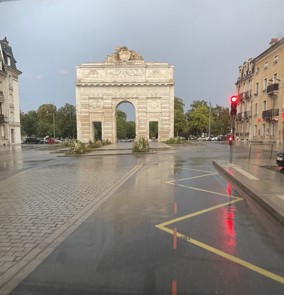 Kurz vor Nancy hört es endlich auf zu regnen, also beschließen wir, hier die Nacht zu verbringen. Im Sommer findet täglich um 22 Uhr auf der Place Stanislas eine Ton- und Lichtershow statt. Diese wollen wir uns gerne anschauen. Leider ist der Wohnmobil Stellplatz bereits belegt und auch die umliegende Parkplätze sind voll. Der große Parkplatz an der Allée Arlette Gruss hat nur Parkbuchten bis 6m Fahrzeuglänge. Als wir überlegen, hier trotzdem kurzzeitig zu parken und danach weiterzufahren, setzt der ungemütliche Regen wieder ein. Also verbraten wir unnötigerweise 45 Minuten, fahren umsonst durch viel zu enge Gassen und verlassen ungesehen Nancy.