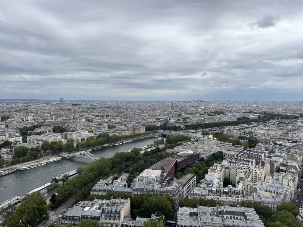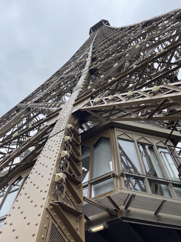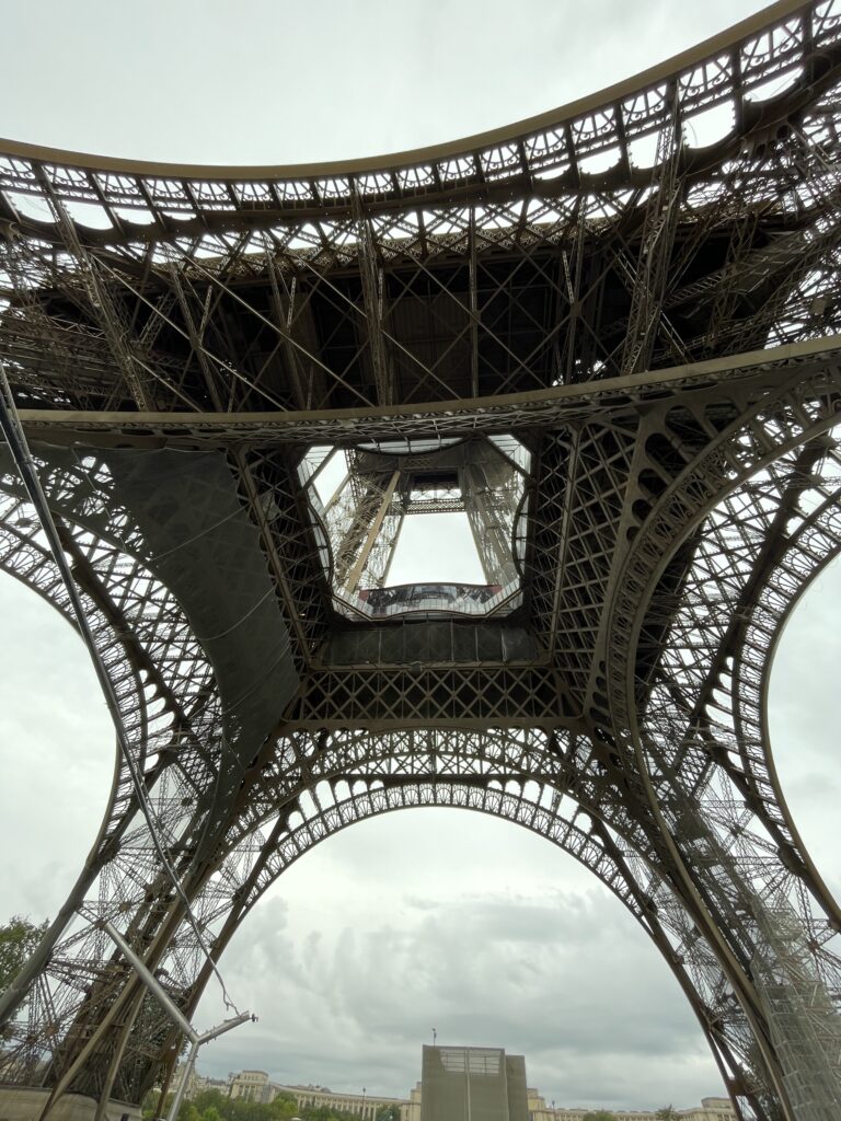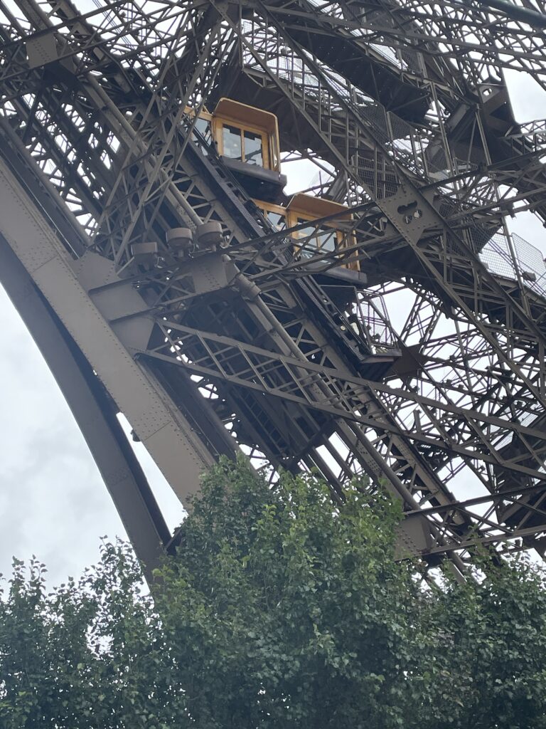 Die Aussicht von oben ist natürlich trotzdem wunderschön, aber das Spannendste ist eigentlich der Aufzug mitten durch die Eisenfachwerkkonstruktion. Aber auch die Schrägaufzüge durch die Turmpfeiler sind beeindruckend, vor allem die riesigen Gegengewichte. Nachdem wir die Aussicht ausgiebig bestaunt haben, setzt plötzlich starker Regen und eisiger Wind ein und es ist wird sehr ungemütlich. Also zurück in den Aufzug und wieder runter. Unten stehen wir Mädels dann eine halbe Stunde bei den Toiletten an. Danach sehen wir auf den digitalen Anzeigebildschirmen, dass der Zugang zur Spitze nun wieder möglich ist – so ein Pech.