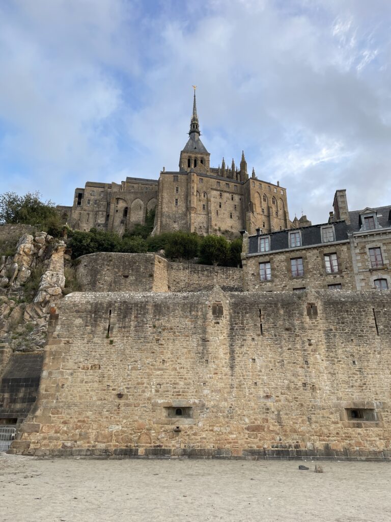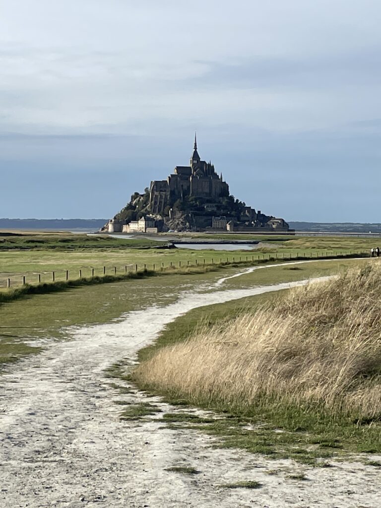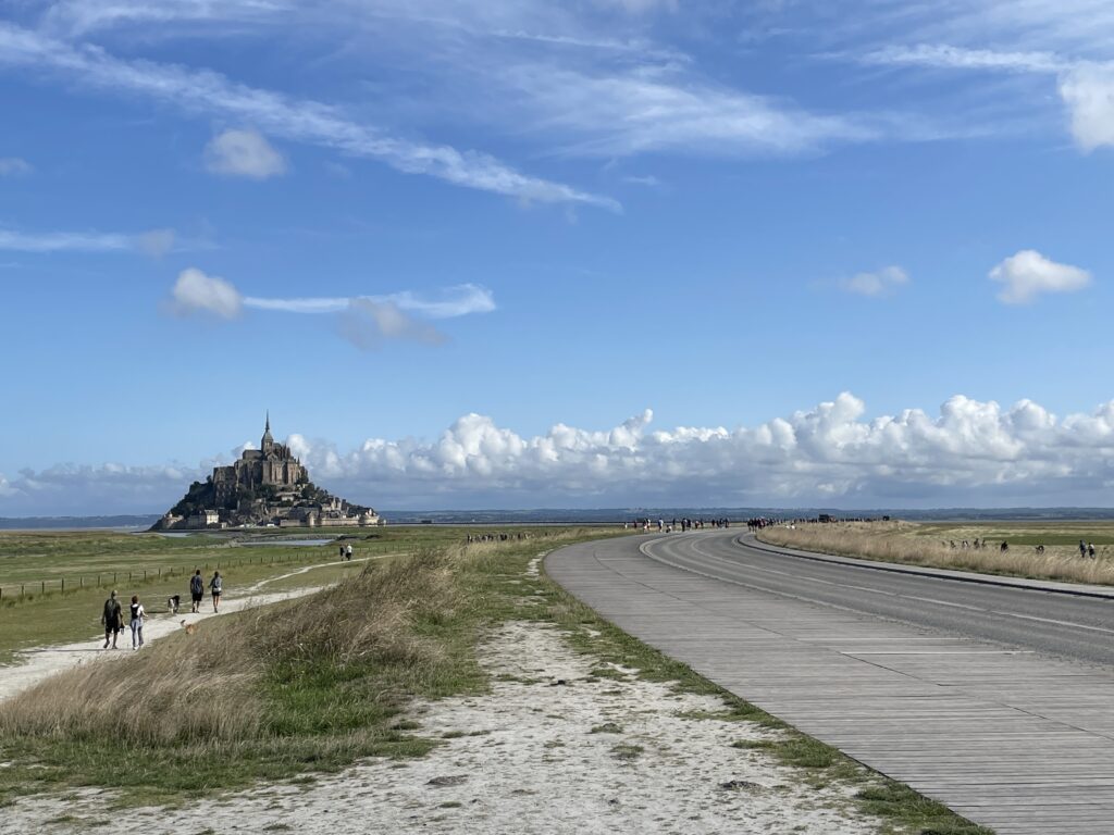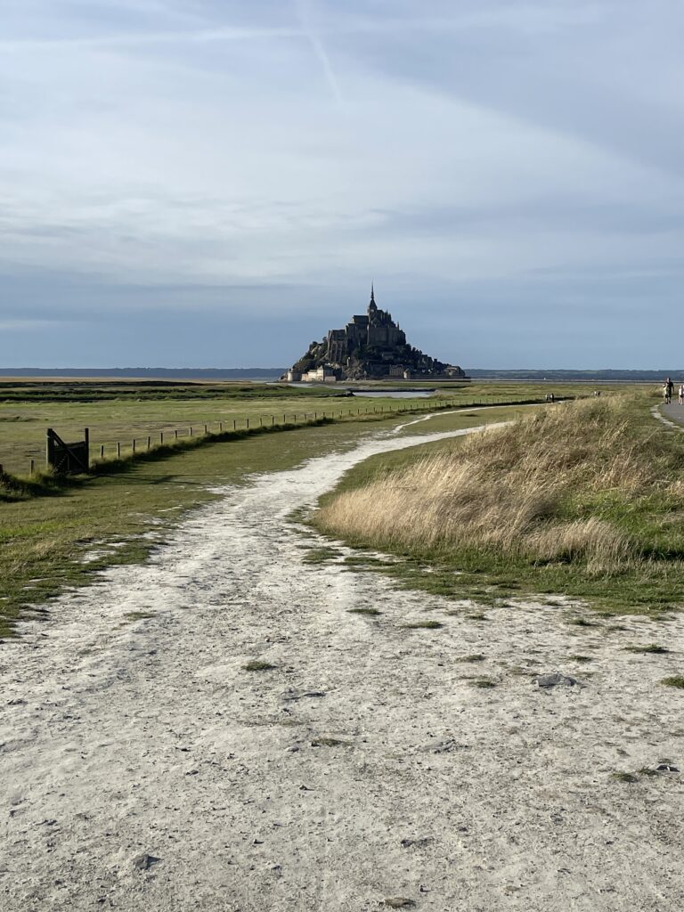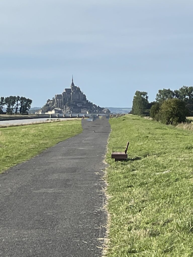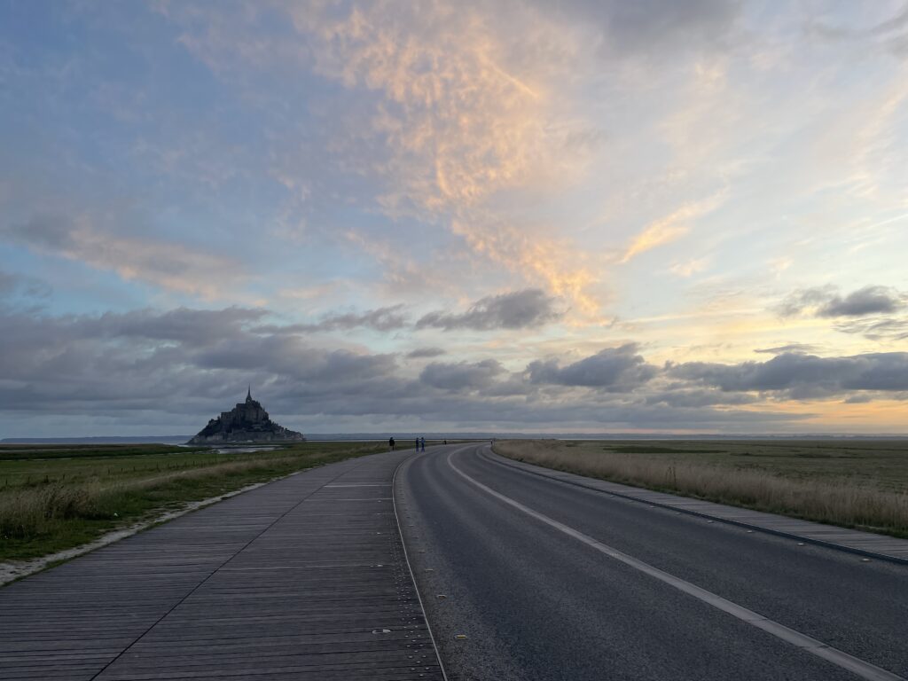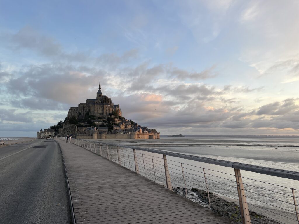 Nach dem Abendessen machen wir Mädels uns mit Scooter und Fahrrad auf den Weg zum 5km entfernten Mont Saint-Michel. Direkt am Stellplatz führt der Radweg vorbei. Immer mit tollem Blick auf den Berg fahren wir hin. Alternativ könnten wir nach 2km auch den kostenlosen Shuttlebus nehmen. Trotz Abendstunde ist (wie erwartet) noch viel los, wir können aber problemlos mit unseren Fahrzeugen über den Damm bis zum Inseleingang fahren. Nach den obligatorischen Fotos werfen wir einen kurzen Blick in die Gassen und fahren dann zurück. Für den Sonnenuntergang zu bleiben, lohnt sich nicht, da es mittlerweile wieder komplett bewölkt ist und auch schnell kalt wird.