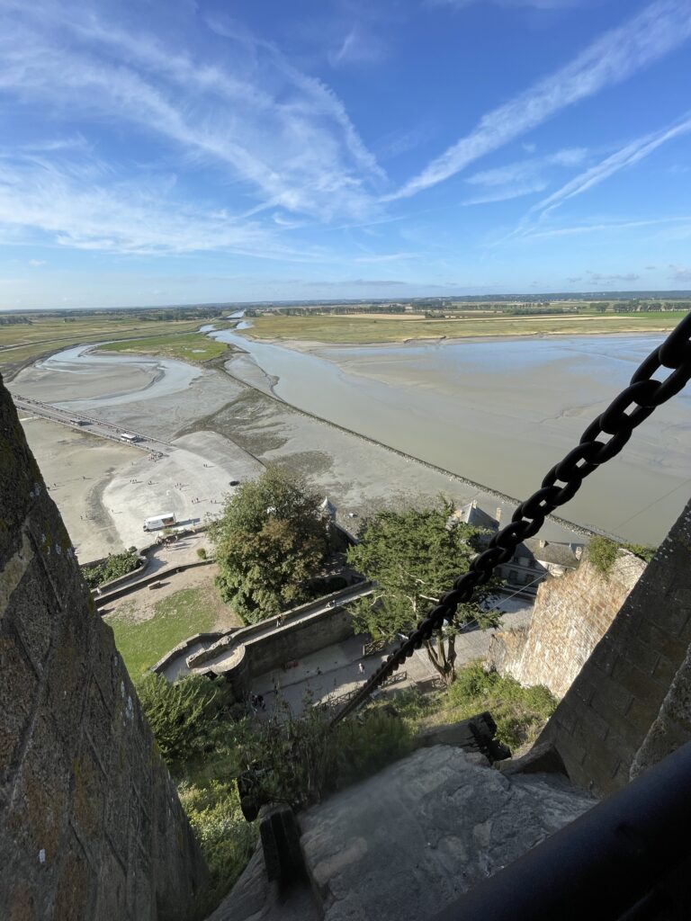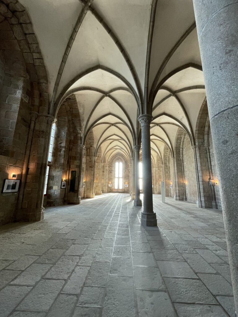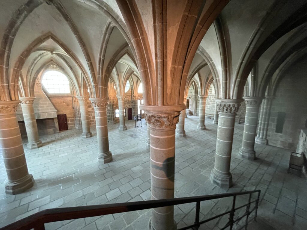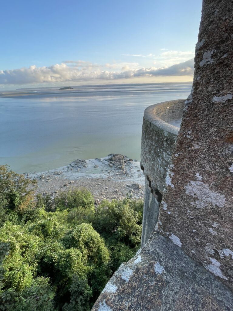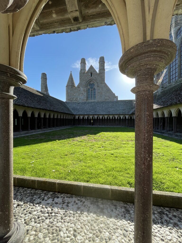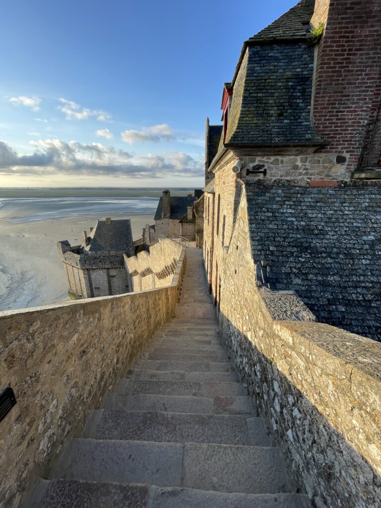 Zurück durch das Tor betrete ich nochmals die Insel und begebe mich zum Eingang der Abtei, die um 9 Uhr ihre Pforten öffnet. So langsam füllt es sich, ich bin aber relativ weit vorne in der Warteschlange und kann so gleich bei Öffnung mein Ticket kaufen (11€ – Vorausbuchung auch online möglich mit gesonderter Warteschlange). Die Besichtigung lohnt sich schon allein wegen der unglaublichen Aussicht. Aber auch die vielen Räume der Abtei, die Treppen und Säulengänge sind sehr schön – vor allem, wenn man so wie ich, fast alles noch für sich hat.