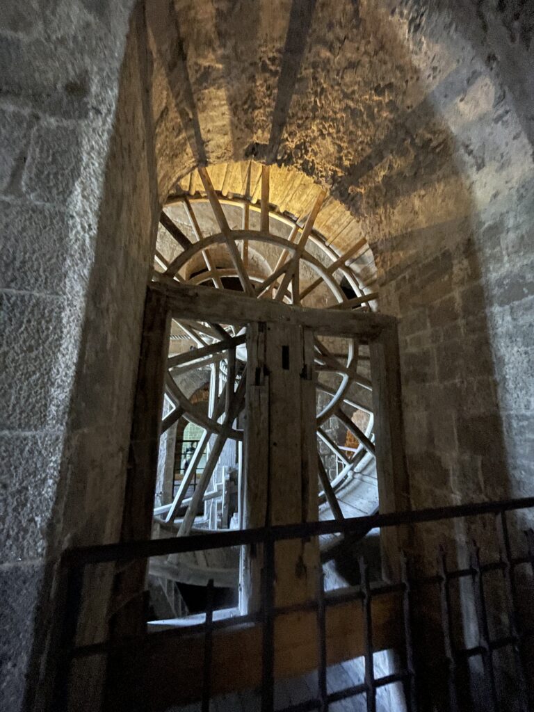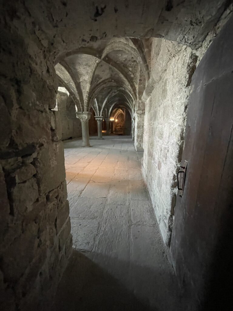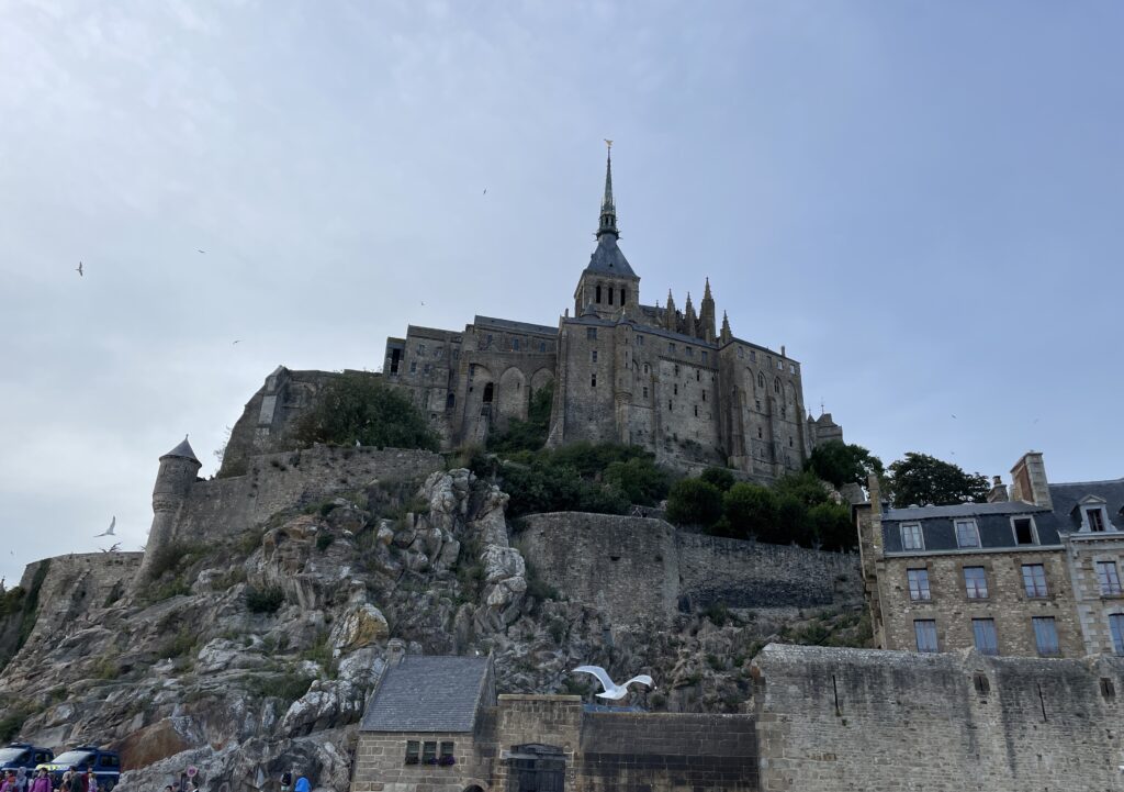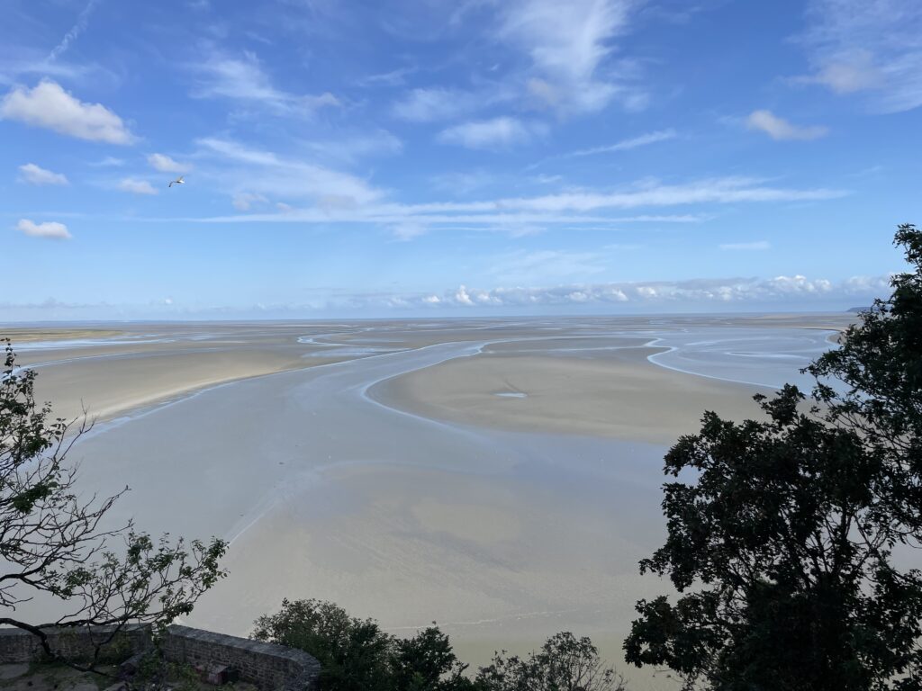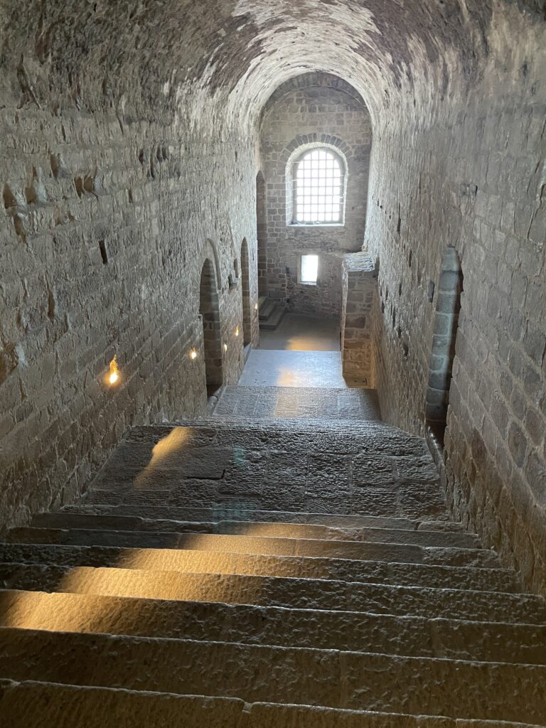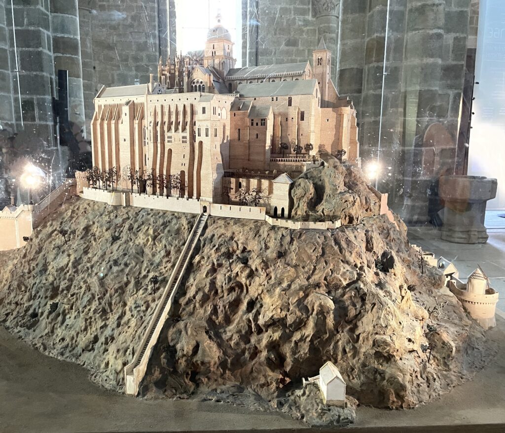 Zurück durch das Tor betrete ich nochmals die Insel und begebe mich zum Eingang der Abtei, die um 9 Uhr ihre Pforten öffnet. So langsam füllt es sich, ich bin aber relativ weit vorne in der Warteschlange und kann so gleich bei Öffnung mein Ticket kaufen (11€ – Vorausbuchung auch online möglich mit gesonderter Warteschlange). Die Besichtigung lohnt sich schon allein wegen der unglaublichen Aussicht. Aber auch die vielen Räume der Abtei, die Treppen und Säulengänge sind sehr schön – vor allem, wenn man so wie ich, fast alles noch für sich hat.