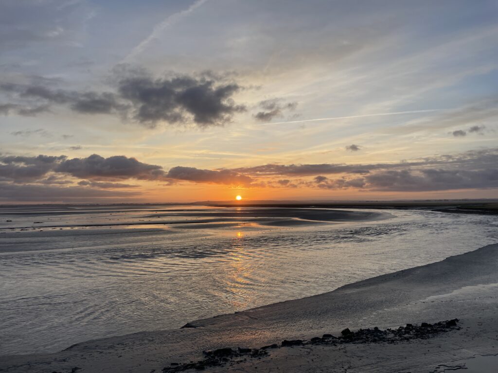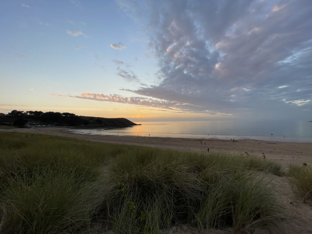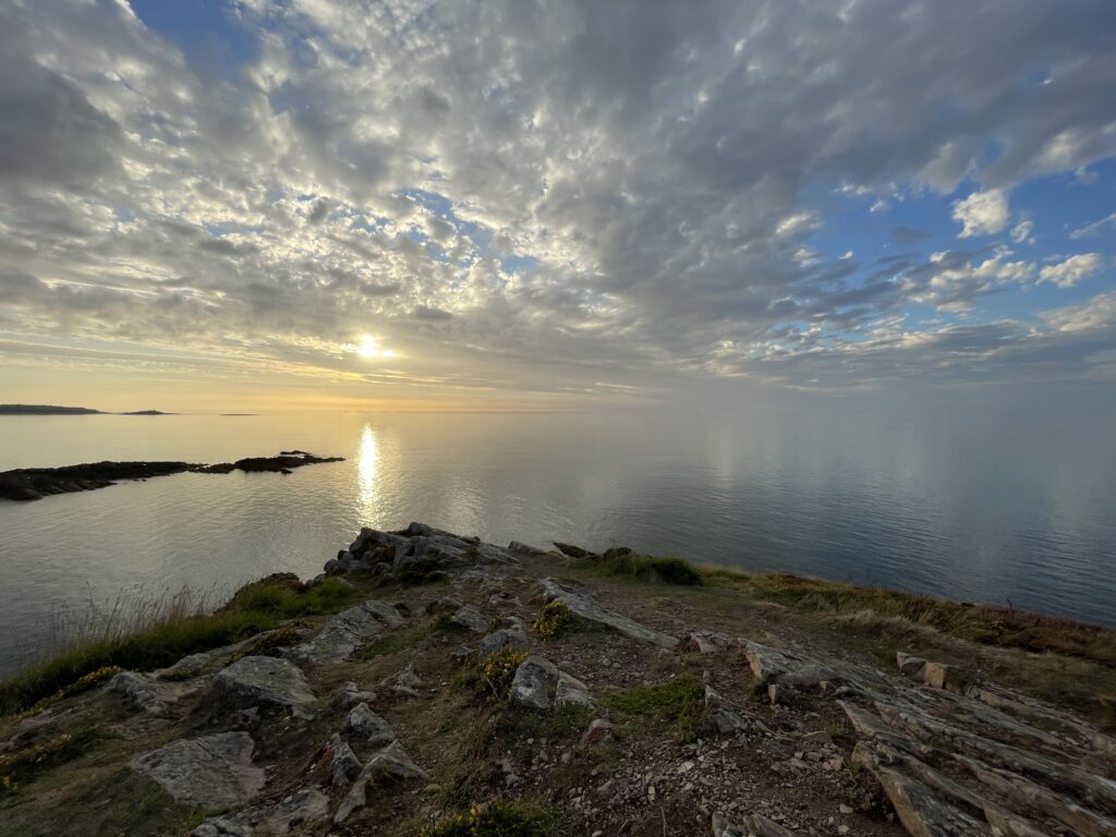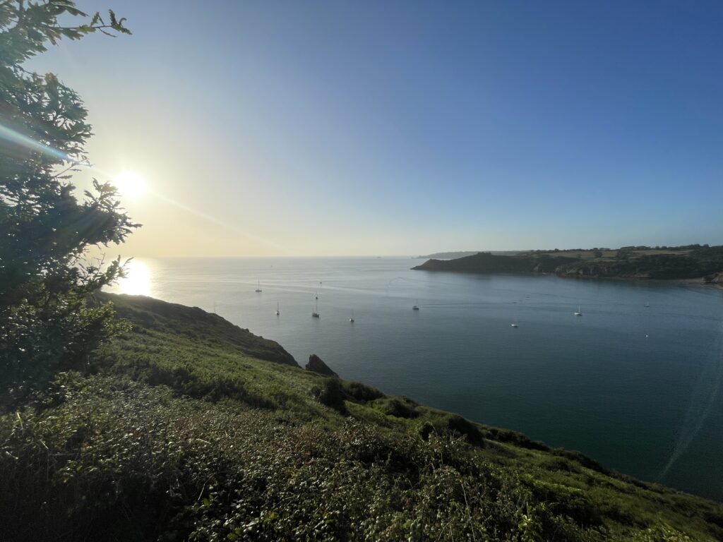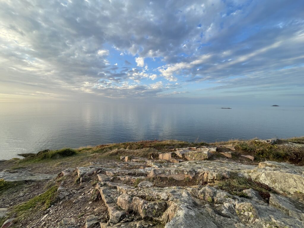 Nach dem Abendessen gehen die Kinder spülen und wir Großen spazieren den durch den Campingplatz führenden Wanderweg GR34 entlang durch das angrenzende Naturschutzgebiet mit Dünengräsern. Am Ende des Strandes wandern wir auf die Felsen, wo sich uns eine traumhafte Aussicht auf den Ärmelkanal bietet und schließlich ein schöner Sonnenuntergang über dem Meer.