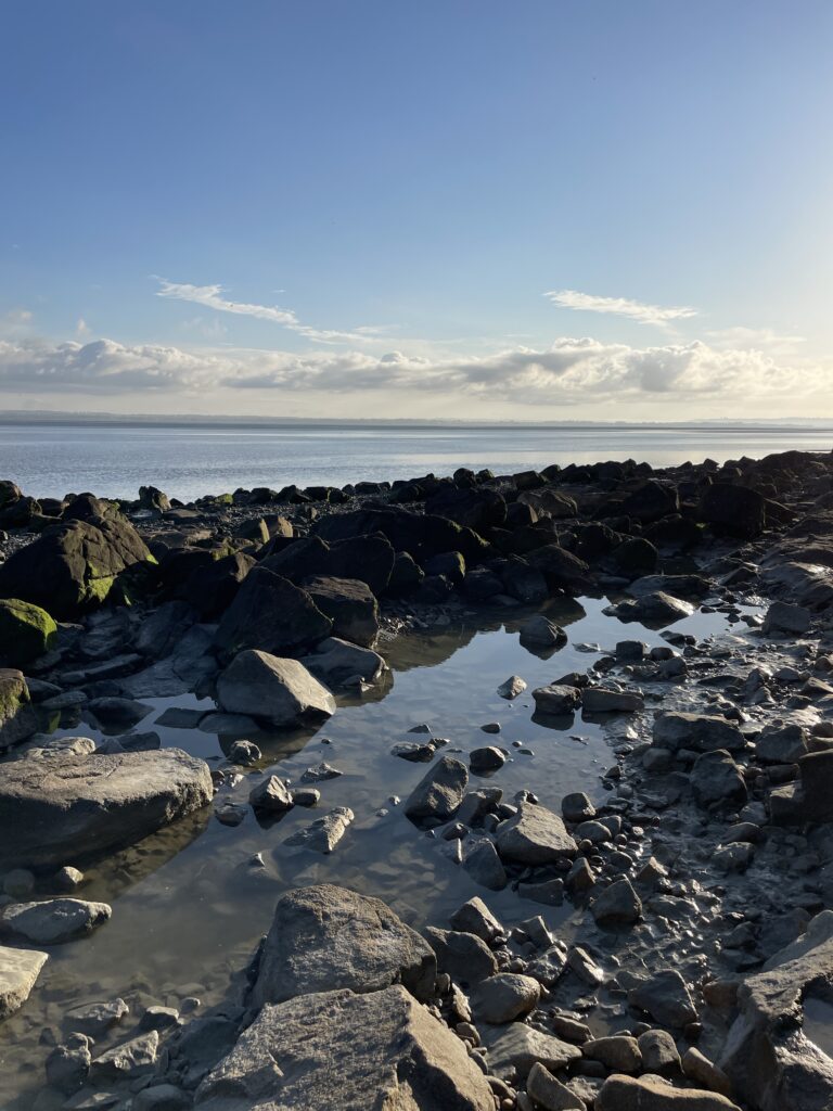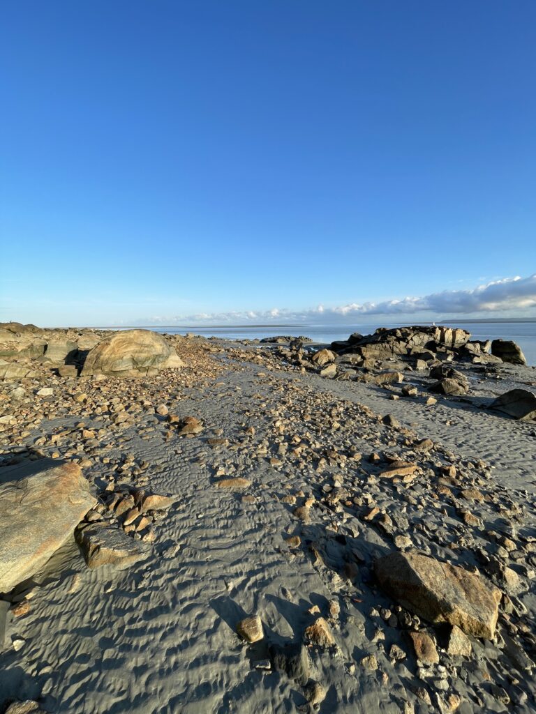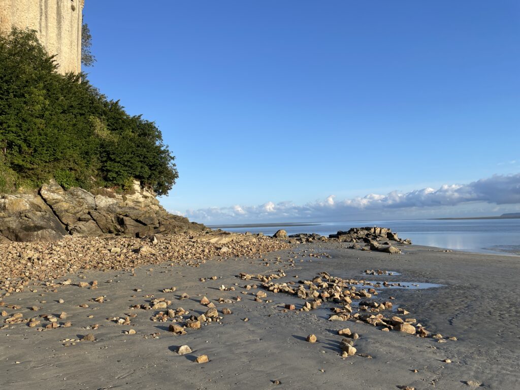 Nachdem ich kreuz und quer und hoch und runter gelaufen bin, setze ich meinen Rundgang auf Sand fort. Bei Ebbe soll man den Berg umrunden können. Ich versuche es, bald wird es jedoch erst steinig und dann felsig und das Gelände immer unwegsamer. Da ich auch mutterseelenalleine bin, kehre ich irgendwann um. Nicht auszudenken, wenn ich hier umknicke oder zwischen den Felsen stürze und mich dann irgendwann die Flut überrascht.