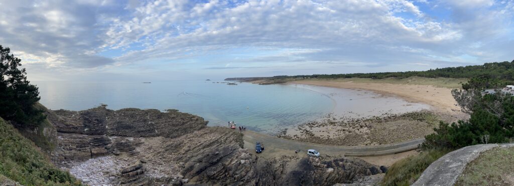 Von hier ist es nur ein Katzensprung auf die „Presqu’île de Quiberon“, die ich unbedingt noch sehen will. Micha hat heute Morgen auch ein Stück davon mit dem Fahrrad erkundet. Trotz einsetzendem Regen ist es unglaublich voll hier. Erst als wir von der Hauptstraße auf die D186a abbiegen, wird es etwas ruhiger auf der Straße. Wir schauen uns den Camping Municipal Kerne an (1 Rue de Port Kerne, Quiberon). Übernachten will aber nur ich, den anderen ist es hier auf der Halbinsel zu voll (wobei der Campingplatz augenscheinlich in der ruhigsten Ecke liegt). Unterwegs halten wir zumindest für einen kurzen Fotostopp, was nicht ganz einfach ist, da alle Plätze höhenbeschränkt sind. Es regnet beständig weiter, also wollen wir schnell weiter. Wir umrunden die Halbinsel und stehen dann allerdings ab Quiberon im Stau. Wir verbraten 2 Stunden im Stop and Go – furchtbar.
