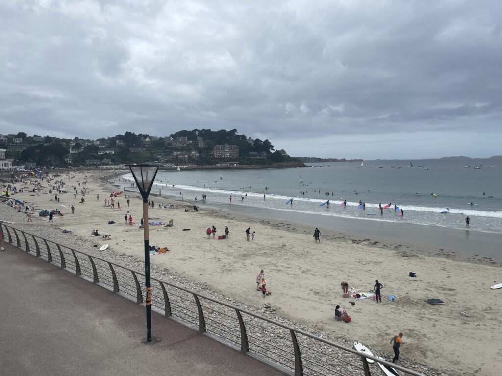 Vom Campingplatz führt ein Weg zum Strand „Plage de Trestraou“ und zur Promenade. Trotz regnerischem und nicht besonders warmen Wetter ist der Strand sehr gut besucht – man könnte meinen es hat 30°C und 25°C warmes Wasser. Die Bretonen sind wirklich hart im Nehmen – ausgewiesen werden 18°C Wassertemperatur, was wir aber nicht glauben. 15 Grad erscheint uns realistischer… Trotzdem sind Dutzende Kinder und Erwachsende im Wasser. Hier gibt es sogar Kinderanimation am Strand. Noch mehr als Schwimmer sieht man allerdings Surfer. Wir gönnen uns ein Eis und beobachten das bunte Treiben.