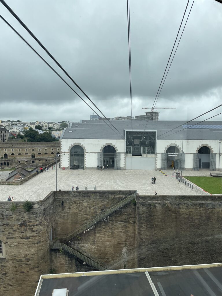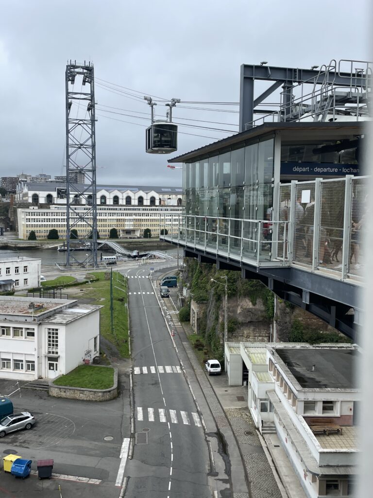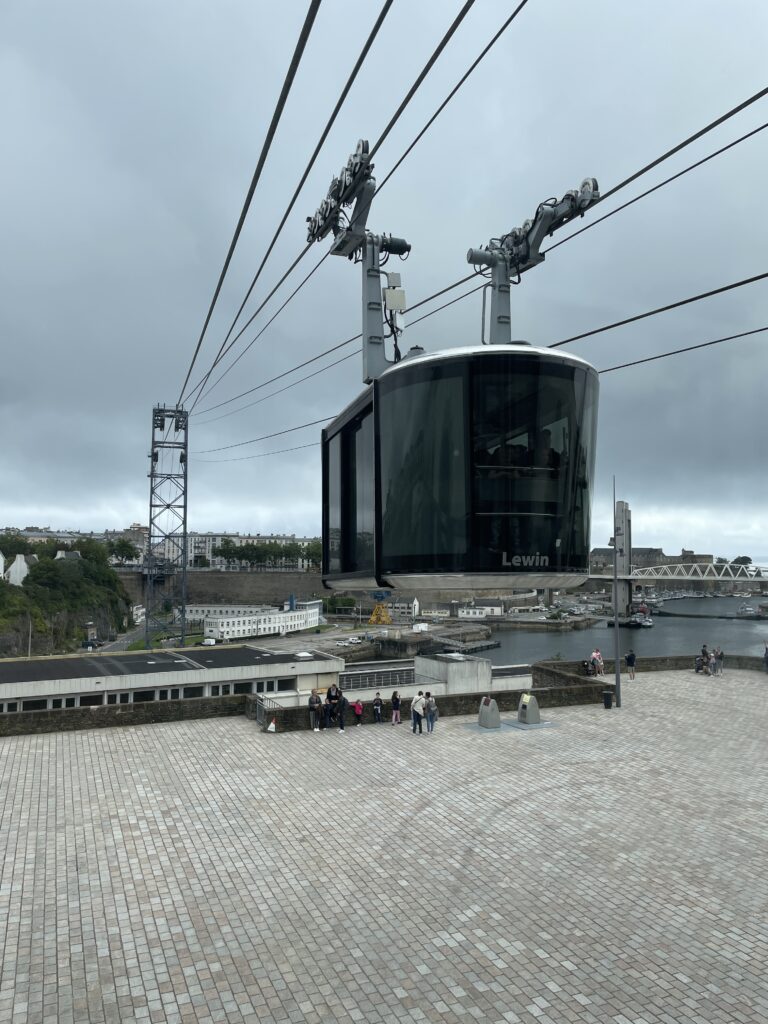 Nach dem Essen sind wir dann auch mit wenigen Schritten an der Seilbahn Téléphérique, die in 72 Meter Höhe innerhalb 3 Minuten den Fluss Penfeld überquert und einen schönen Ausblick bietet (Hin und Rück 2,20€ p.P.). Wir müssen etwas anstehen und fahren dann auf die andere Seite. Hier ist die Seilbahnstation in einer Werkshalle mitsamt Kulturzentrum untergebracht. Es gibt Geschäfte, Ausstellungen und das gesamte UG ist für Rollerfahrer und Skater freigegeben. Zurück geht es wieder mit der Seilbahn und die Kinder freuen sich nochmal über das Guckloch im Boden. Anschließend stöbern wir noch durch ein paar Geschäfte, allerdings ohne großen Enthusiasmus. Die Innenstadt ist nicht ansprechend und die einzelnen Tropfen gehen nun in strömenden Regen über. Also schnell zurück ins Womo.
