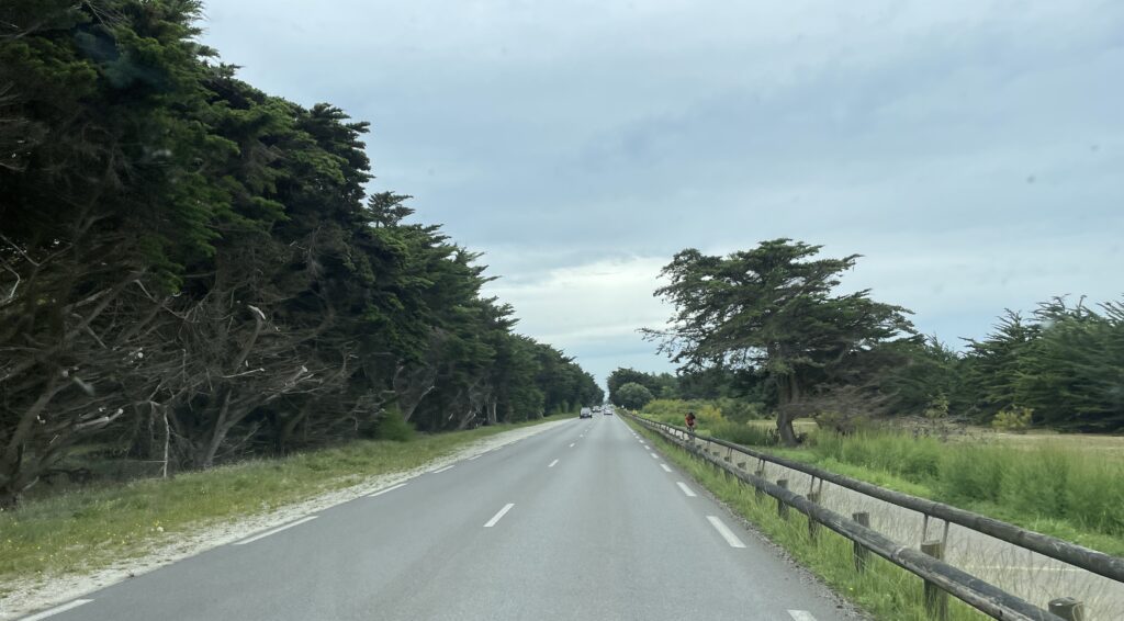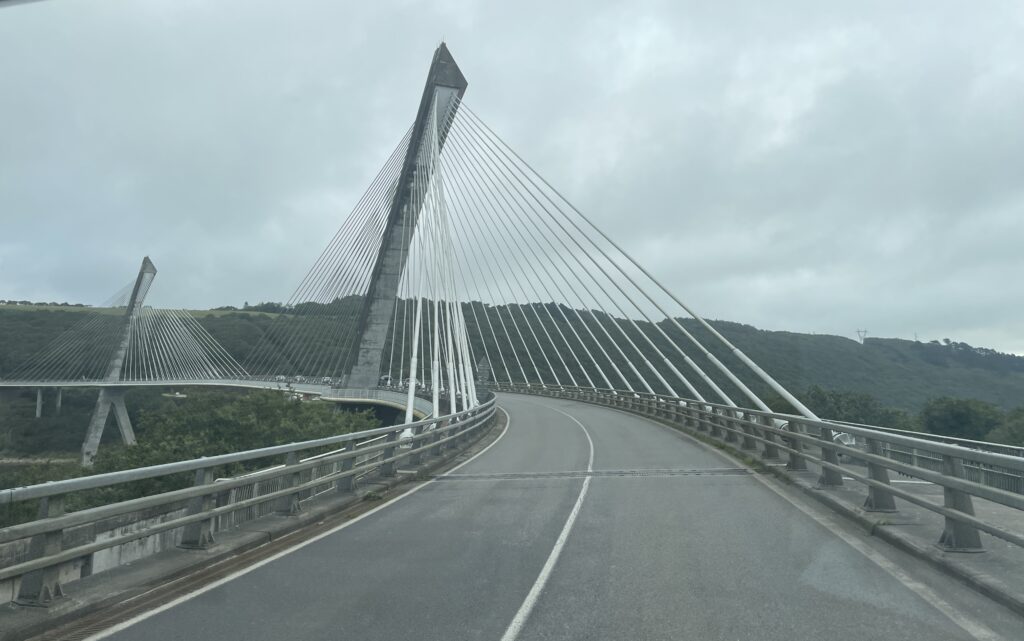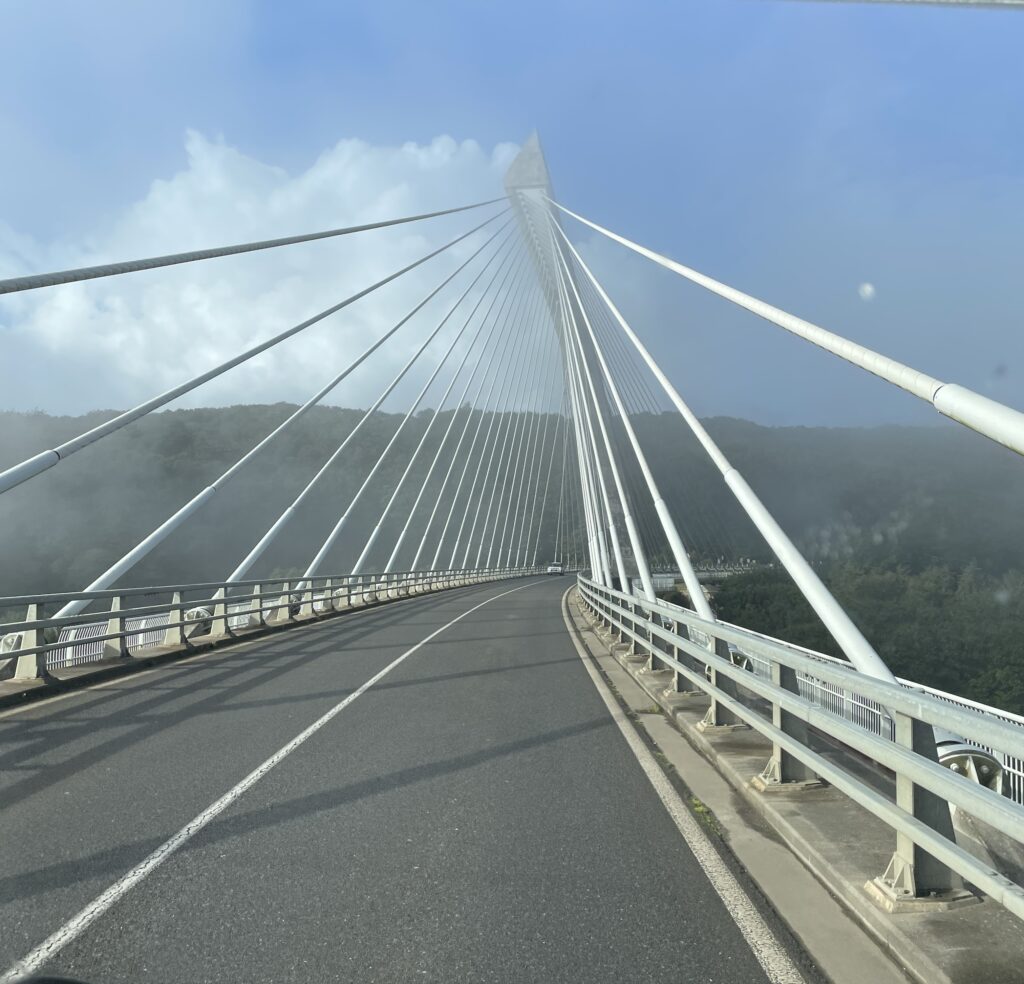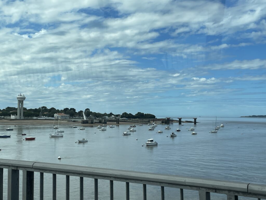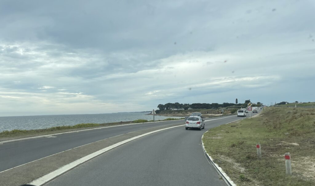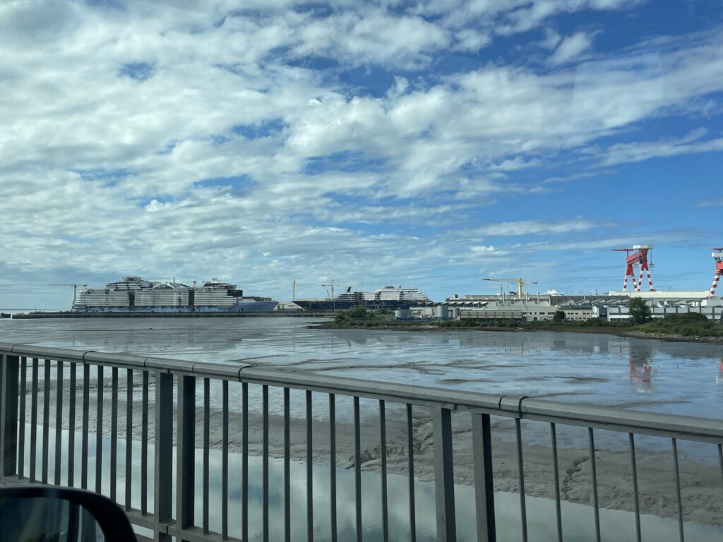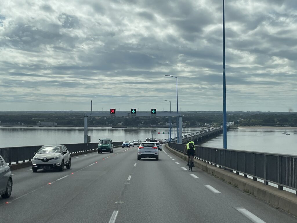 Wir fahren auf Wunsch der Familie weiter Richtung Süden und verlassen damit endgültig die Bretagne und erreichen die Region Pays de la Loire. Schön war’s in der Bretagne, wenn uns auch beständiges Badewetter gefehlt hat. Nach einer guten Stunde passieren wir Saint-Nazaire mit der gigantischen Brücke Pont de Saint-Nazaire – die längste Brücke Frankreichs mit 3356 Metern. So lang kommt sie uns gar nicht vor, dafür umso höher. Man fährt ziemlich steil bergauf und runter – fühlt sich fast an wie in einer Achterbahn 😊. Warum sie so hoch gebaut wurde, zeigt sich dann von oben, wo wir den besten Blick auf riesige Kreuzfahrtschiffe haben. Über 30.000 Fahrzeuge passieren täglich die Brücke. Und auch ein paar mutige Fahrradfahrer.