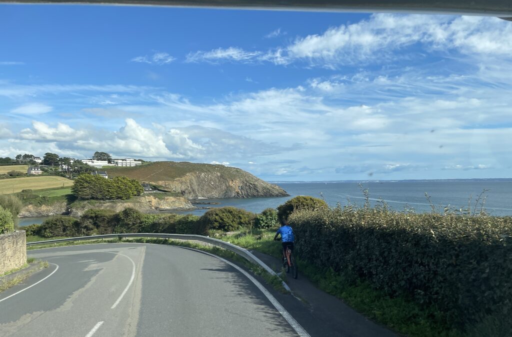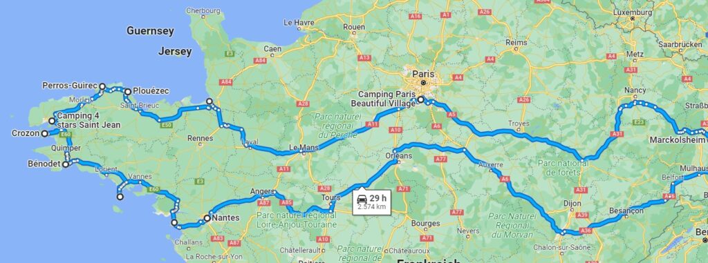Der Rückweg ab Ploumanac’h ist dann nicht nur stressig, sondern auch nicht besonders schön, da er mitten durch Perros Guirec und stetig bergauf an der Straße entlangführt. Das trübt ein bisschen die schönen Eindrücke vom Hinweg. Nach 2:30h kommen wir ziemlich verschwitzt endlich wieder am Campingplatz an und hüpfen noch schnell unter die Dusche. Die Mädels haben zwischenzeitlich schon aufgeräumt und Tisch und Stühle zusammengeklappt. Um halb 12 verlassen wir dann planmäßig den Platz. Wir bezahlen stolze 74,30€. Da bezahlt man die Lage und den touristischen Hotspot natürlich mit.