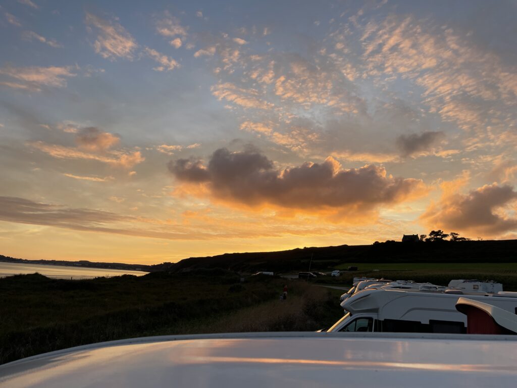Wir fahren zum Abendessen an den Plage de Postolonnec (48.2394, -4.4638) und genießen Baguette und Käse auf der Kaimauer mit wunderschönem Blick aufs Meer. Luki muss natürlich auch noch ins Wasser springen. Wir könnten hier auch übernachten, fahren dafür aber noch wenige Kilometer weiter an den Strand L’Aber (48.2355, -4.4472) – ein traumhaftes kostenloses Plätzchen (Campingverhalten nicht erlaubt, da Naturschutzgebiet – leider halten sich mal wieder nicht alle dran) hinter den Dünen mit breitem Strand  Beides erinnert uns sehr an Dänemark. Zum Abschluss dürfen wir noch einen wunderschönen Sonnenuntergang genießen – was will man mehr?!