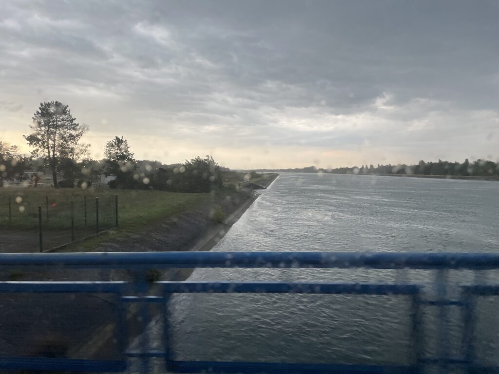 Um 15:30 Uhr sind wir Fünf am 3. August 2023 endlich wieder on the road – die Sommerferien sind da! Morgen wollen wir in Paris sein. In Freiburg haben wir gleich einen dicken Stau und überqueren deshalb erst um kurz vor 18 Uhr den Rhein und somit die Deutsch-französische Grenze. Wir erreichen die Ecluses von Marckolsheim und da gerade ein großes Schiff (ein Tanker?) die Schleuse passieren will, halten wir spontan an, um zuzuschauen. Kaum schließt sich die Schleusenkammer, öffnen sich die Himmelsschleusen und es regnet in Strömen. Also flüchten wir uns zurück ins Womo und fahren weiter.