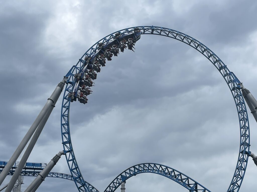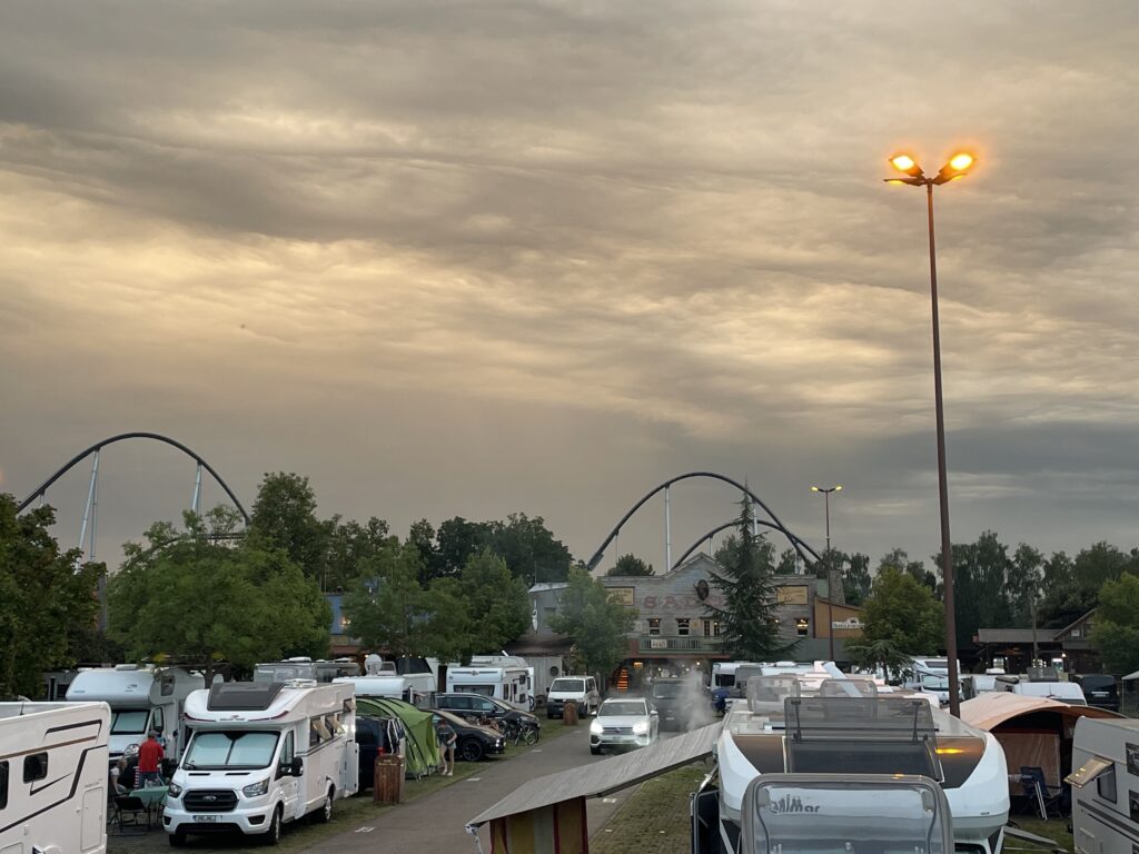 Nachdem wir dann unseren Stellplatz bezogen und geduscht haben, nehmen wir noch einen Absacker im Saloon und genießen die tolle Livemusik und den Ausblick auf die Achterbahn Silver Star.