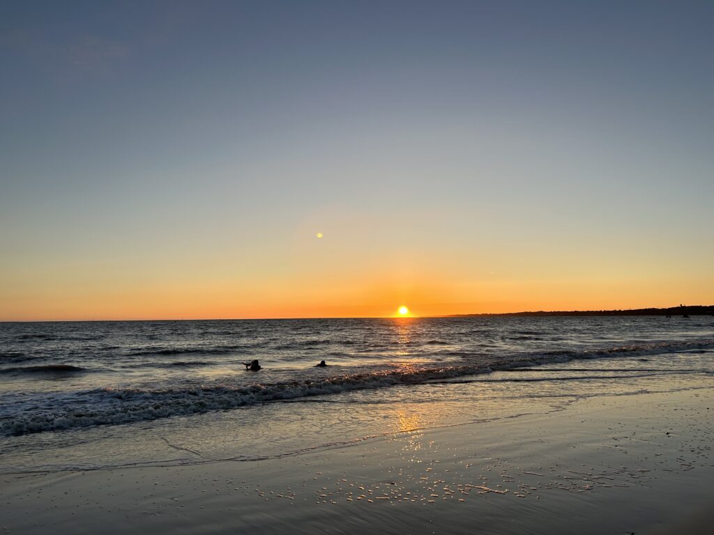 Nach dem Mittagessen geht es ab zum Pool. Es gibt mehrere Becken und Rutschen sowie ein Hallenbad. Die Kinder sind happy und wir entspannen auf den Sonnenliegen, die es hier in ausreichender Zahl gibt. Leider ist es schon wieder bewölkt und windig – etwas wärmer dürfte es noch sein. Nach dem Abendessen ist für die Kinder Spülen angesagt und wir Großen laufen zum Strand (ca.500m entfernt). Gerne würden wir noch reinspringen, da das Wasser überraschend warm ist und der Abend mild. Badesachen haben wir aber keine dabei, so bleibt es bei den Füßen. WIr spazieren einfach ein bisschen am Strand entlang und anschließend durch das nette Örtchen, wo es einige Cafés und Restaurants und einen kleinen Supermarkt gibt. Jetzt am Abend ist auch einiges los. Als wir zurück sind, machen sich die Kinder auf den Weg, um sich den Sonnenuntergang am Meer anzuschauen.